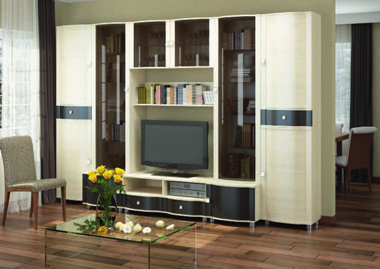 Контрастный дизайн фасада и волнистые стеклянные вставки в дверцах шкафов.