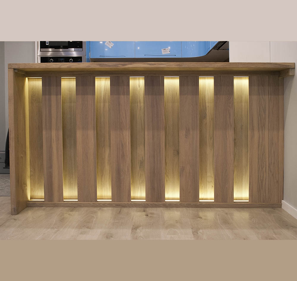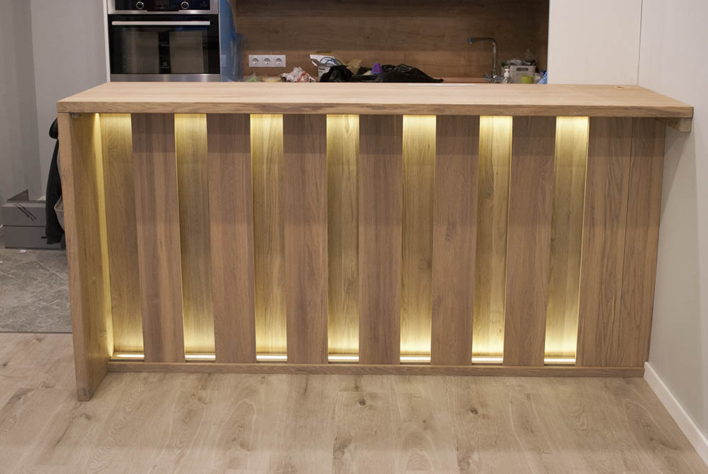 Массивная барная стойка с опорой. Светодиодная подсветка, спрятанная в пазах конструкции.