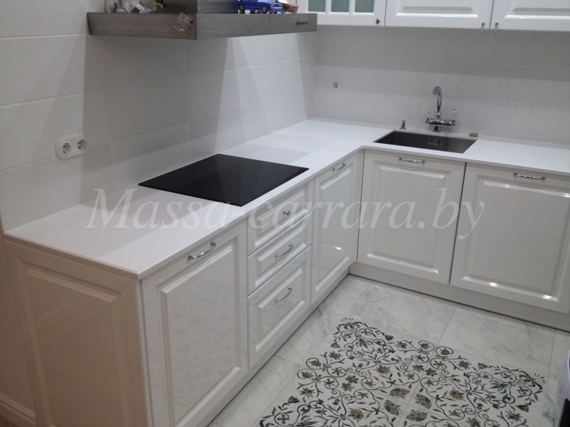 Качественная столешница выполнена их прочного искусственного камня. Модель имеет П-образную форму, которая делает процесс использования рабочих поверхностей значительно удобнее. Данный материал отличается прекрасными эксплуатационными характеристиками, очень долговечен и не требует особого ухода. Светлый оттенок поверхности подобран в цвет остальной кухонной мебели.