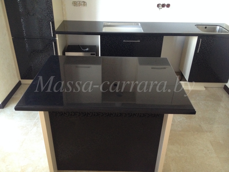 Черная столешница будет особенно выигрышно выглядеть на фоне светлых кухонных фасадов и стен. Поверхность имеет приятный глянцевый блеск, который добавляет изделию стиля и лоска. В качестве материала столешницы используется искусственный камень, имеющий высокую прочность и износостойкость. Для поддержания опрятного внешнего вида столешницы ее достаточно протирать сухой тряпкой.