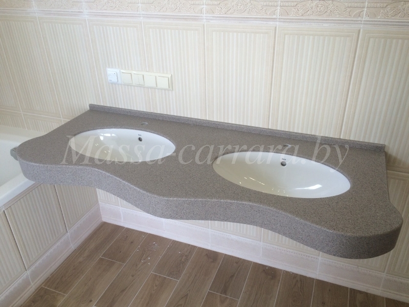 Данная модель столешницы обладает необычной фигурной формой. Плавные переходы позволяют избавить конструкцию от острых углов, и тем самым обезопаситься от травмирования. На поверхности столешницы присутствует два овальных выреза, предназначенных для установки чаш умывальника. Прочный искусственный камень имеет приятную гладкую текстуру и окрашен в спокойный серый цвет.
