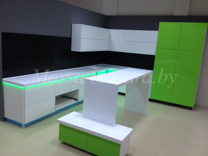 Монолитная белая столешница в сочетании с оригинальной встроенной подсветкой создает на кухне действительно уникальный и необычный интерьер. Модель выполнена из искусственного камня высокой прочности. Данный материал отлично переносит высокие температуры и прямой контакт с влажной средой. Отшлифованная поверхность не требует особого ухода и легко поддается уборке.