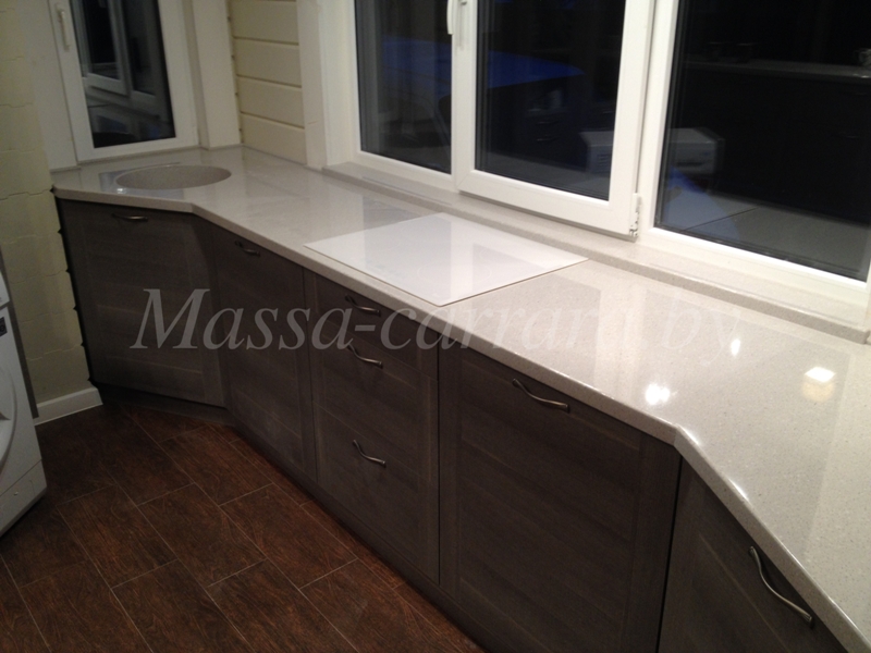 Оригинальное решение объедить рабочую поверхность столешницы с подоконником актуально для малогабаритных помещений. В качестве материала столешницы выступает высокопрочный искусственный камень с идеально отшлифованной поверхностью. Изделие имеет привлекательную глянцевую текстуру, способствующую повышению освещенности кухни. Камень устойчив к теплу и влаге.
