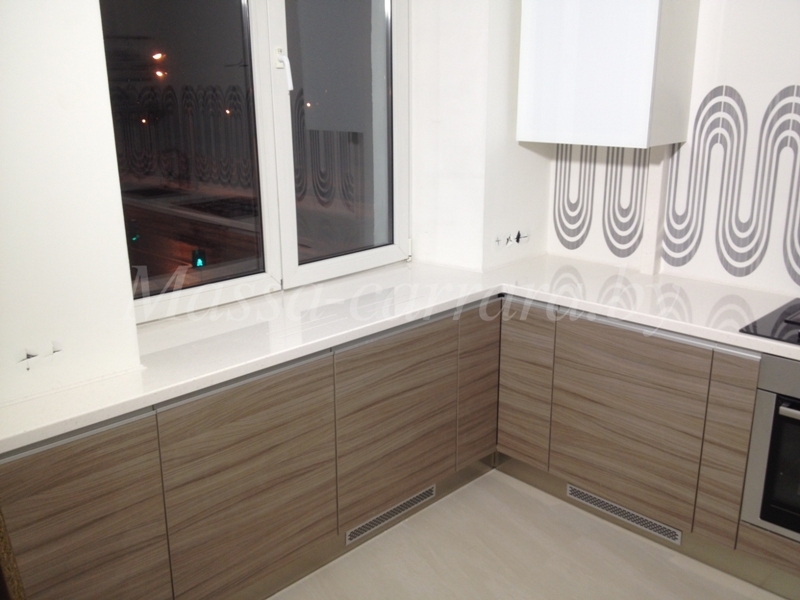 Оригинальное решение по объединению рабочей поверхности и подоконника имеет массу преимуществ. Это позволяет не только значительно увеличить площадь рабочей поверхности, но и благоприятно сказывается на общем интерьере кухни. Столешница выполнена из высокопрочного искусственого камня, обладающего набором всех необходимых параметров. Привлекательная глянцевая поверхность не видоизменяется в процессе эксплуатации.
