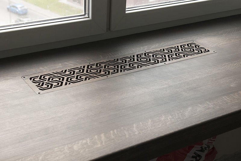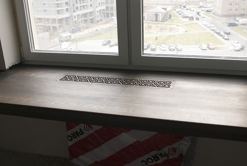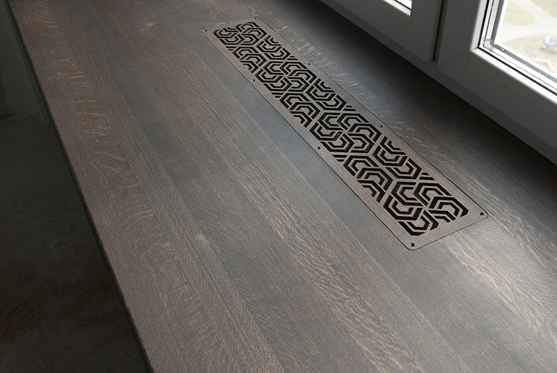 Стол-подоконник изготовлен из натурального массива. Покрытием служит масло Rubio Monocoat Charcoal, защищающее поверхность от негативных факторов. Для лучшей функциональности подлокотник оснащен специальной дубовой решеткой вентиляции.