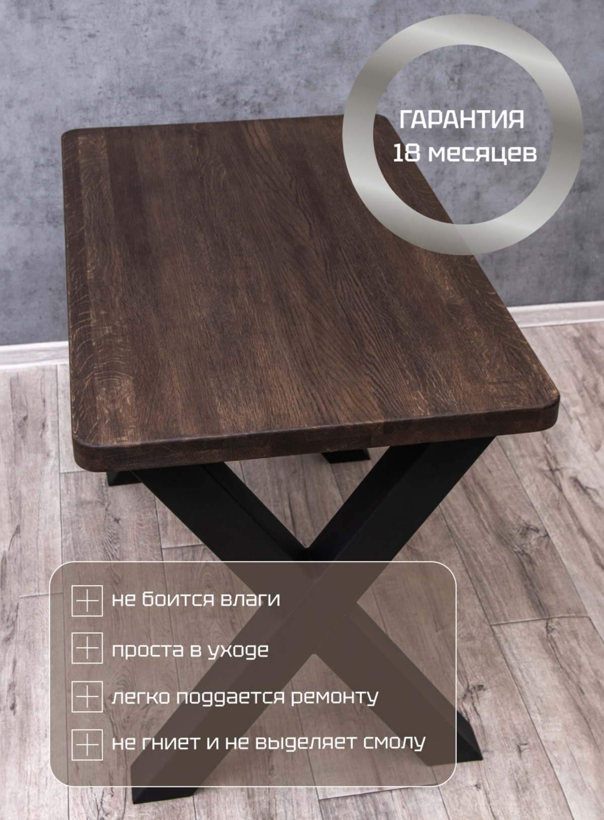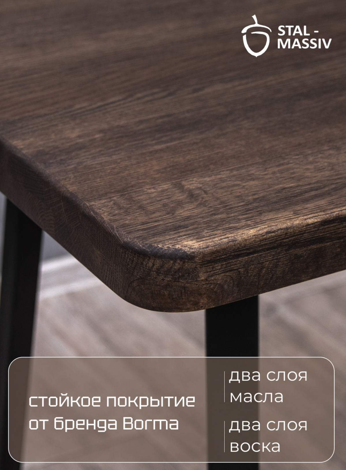 Массив дуба, используемый для изготовления столешницы— прочный, износостойкий и влагоустойчивый материал, способен выдерживать значительные нагрузки и служить на протяжении многих лет. Деревянный щит из дуба покрыт двумя слоями итальянского масла Borma и специальным воском.