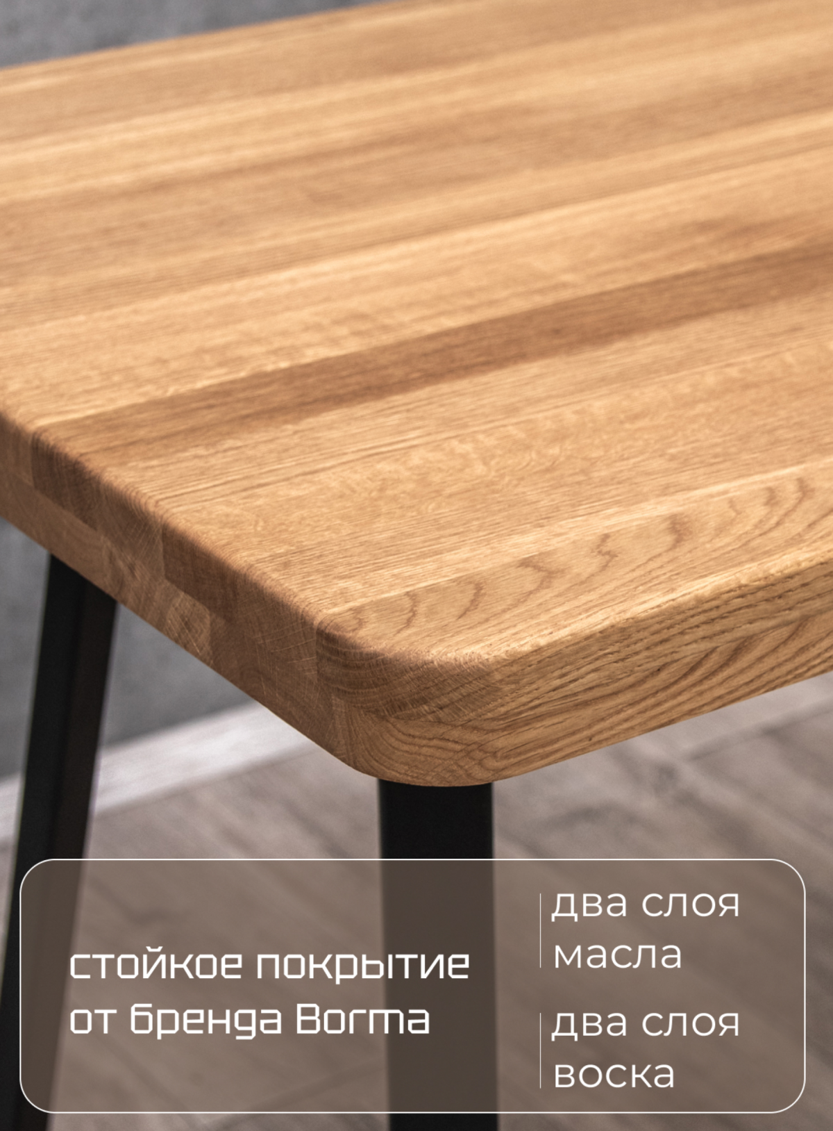 Массив дуба, используемый для изготовления столешницы— прочный, износостойкий и влагоустойчивый материал, способен выдерживать значительные нагрузки и служить на протяжении многих лет. Деревянный щит из дуба покрыт двумя слоями итальянского масла Borma и специальным воском.