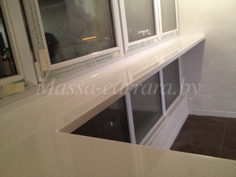 код 80758Подоконник из искусственного светлого камня. Угловая конструкция.