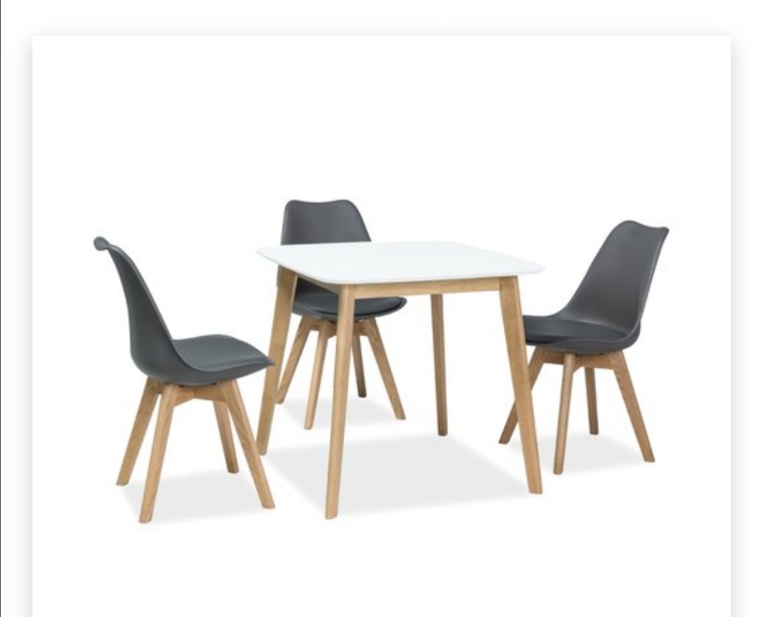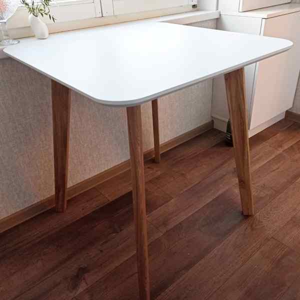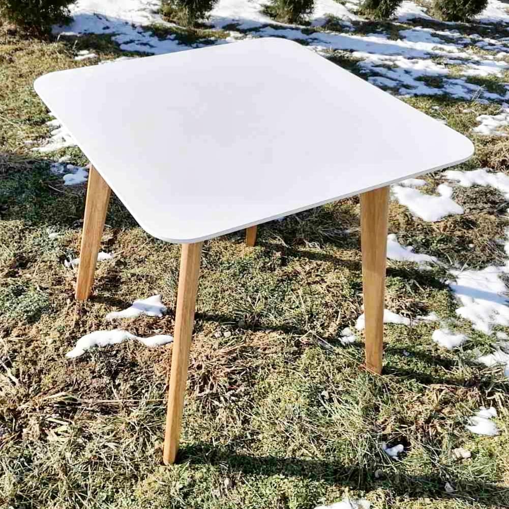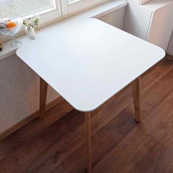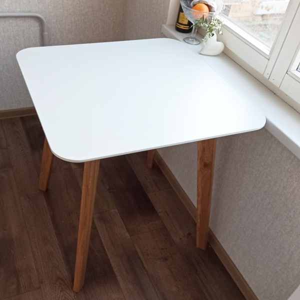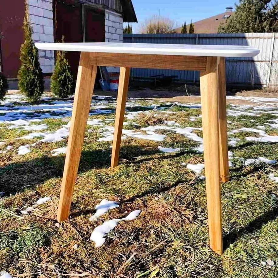 Столешница изготовлена из МДФ и окрашена в белый цвет, ноги — натуральный дуб.