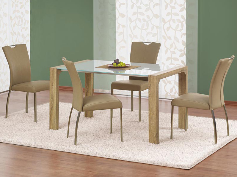 Обеденный стол «Halmar Kevin» обладает широким выбором цветовой гаммы, которую можно выбрать с оглядкой на интерьер комнаты. Модель оснащена стильной и просторной стеклянной столешницей, которая отлично гармонирует с общим дизайном стола. Отличительной особенностью изделия является относительно простая сборка, не отнимающая много времени.