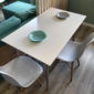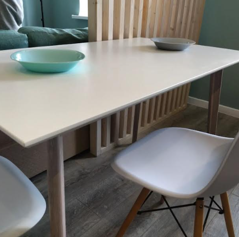 Столешница изготовлена из МДФ и окрашена в белый цвет, ноги — массив дуба выбеленный.