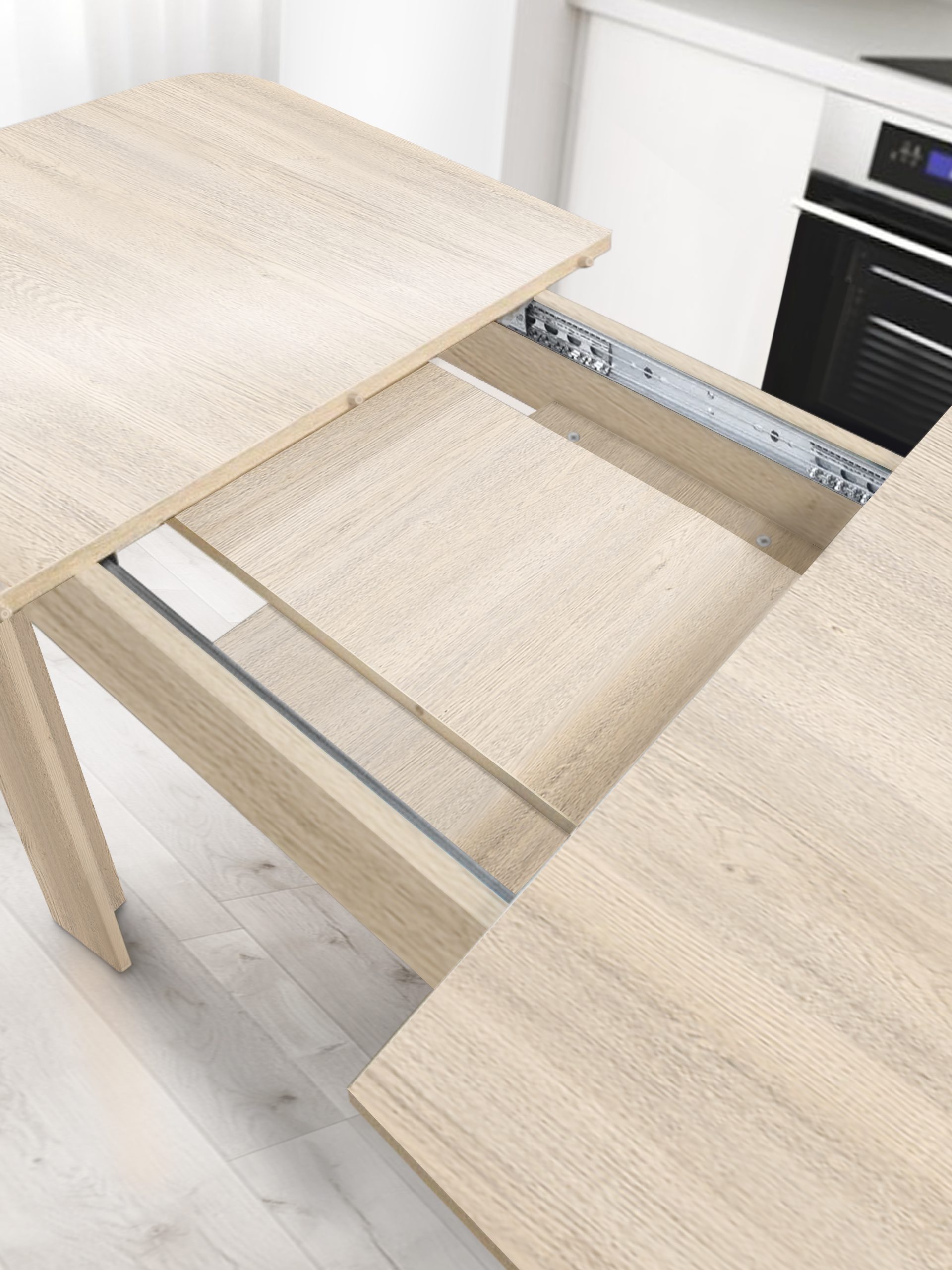 Габариты: 930(1280)х930х771 мм. Материал: массив ольхи, МДФ облицованная натуральным шпоном дуба.