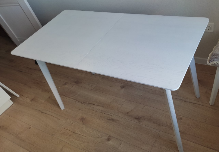 Размер: 1300(+440)х650 мм. Столешница: мдф+шпон дуба в белой эмали. Ножки: массив дуба.