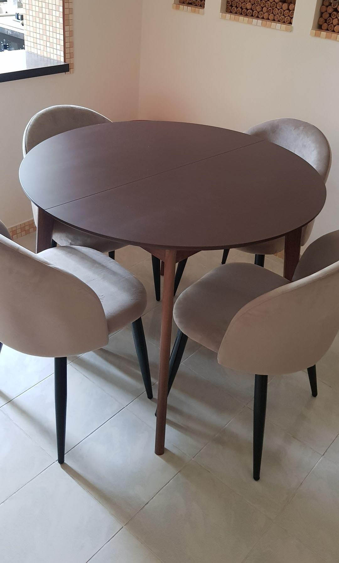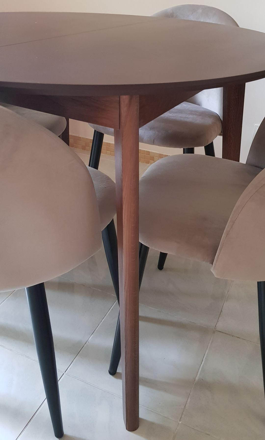 Столешница изготовлена из МДФ и окрашена в шоколадный цвет, ноги — массив дуба.
