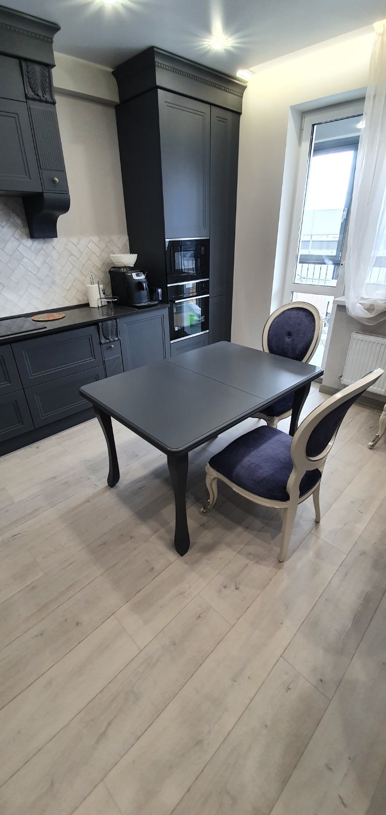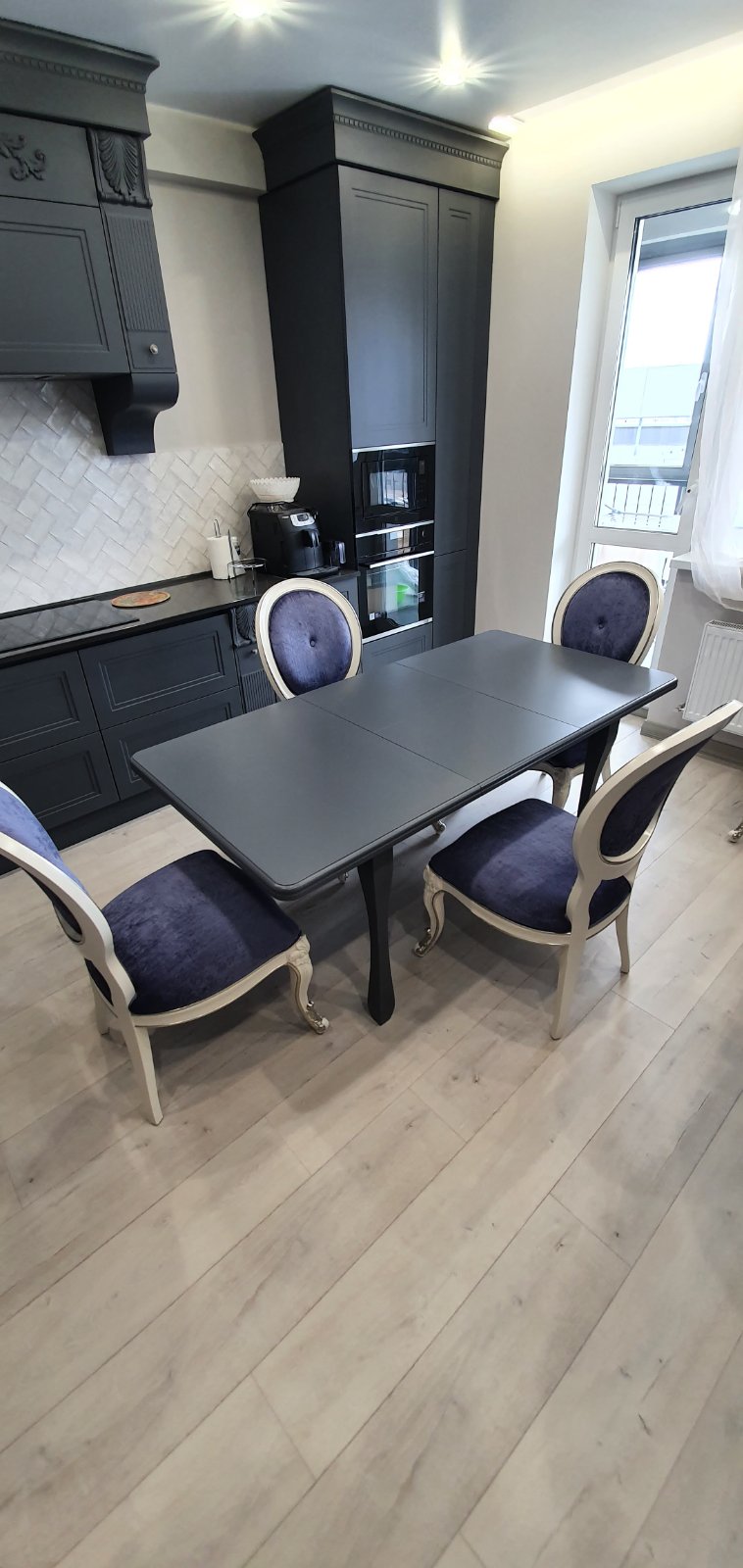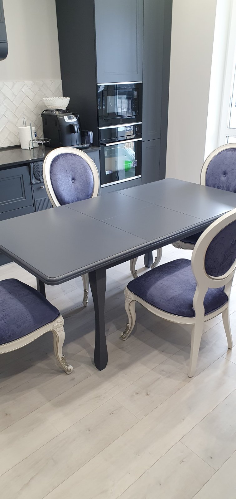 Срощенная столешница толщиной 30 мм окрашена по RAL 7015. Ножки и подстолье - массив крашенный. Система разложения "бабочка" на 49 см.