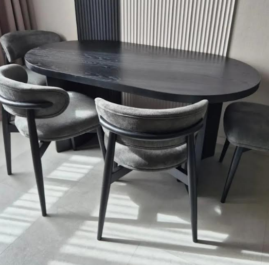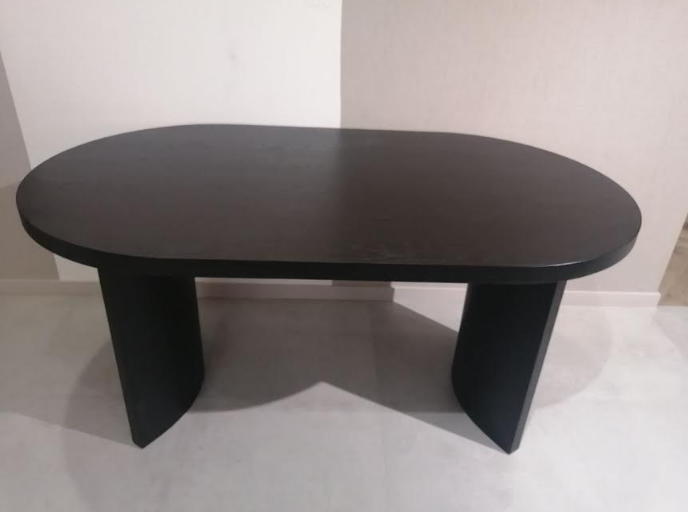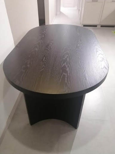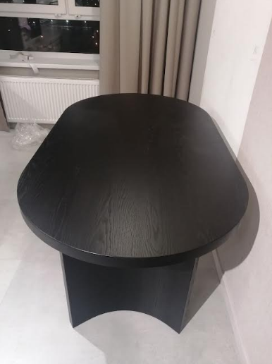 Срощенная столешница изготовлена из МДФ толщиной около 40 мм, шпонированная дубом и окрашена в черный цвет.