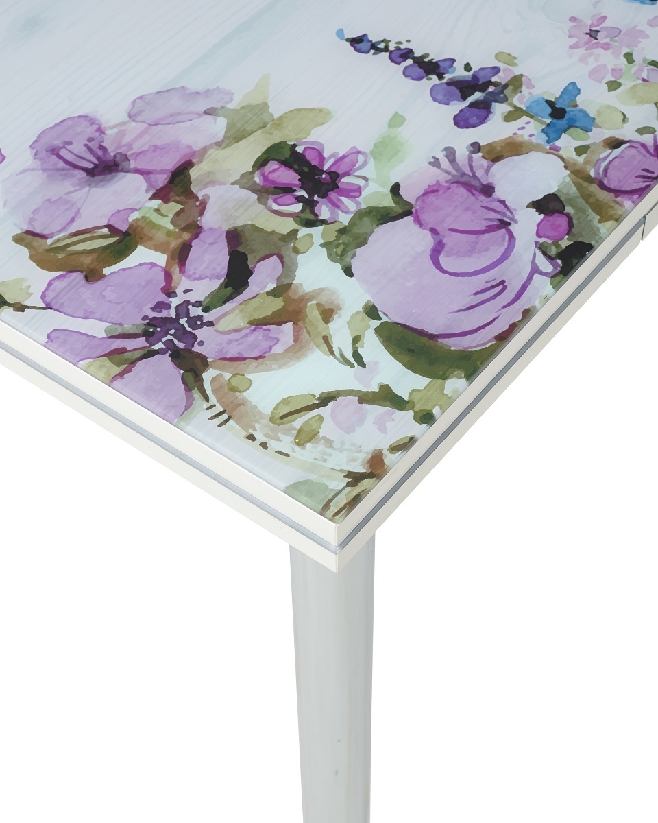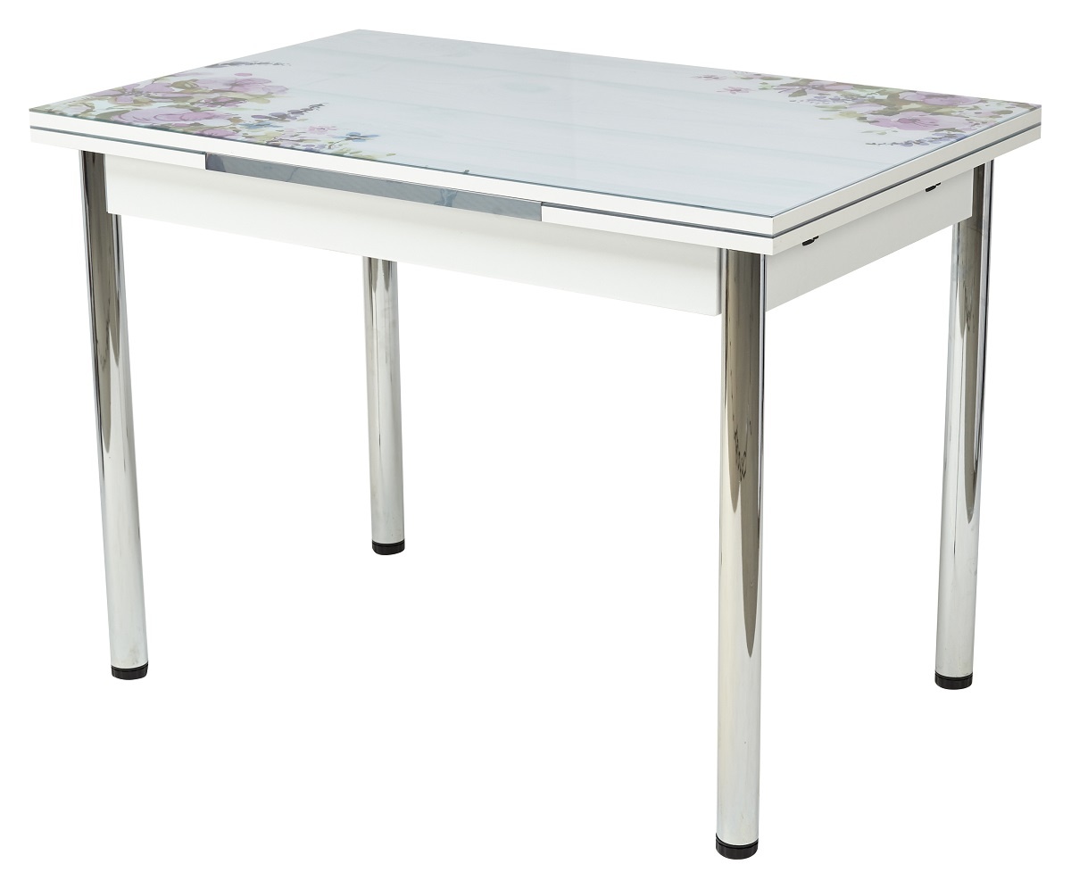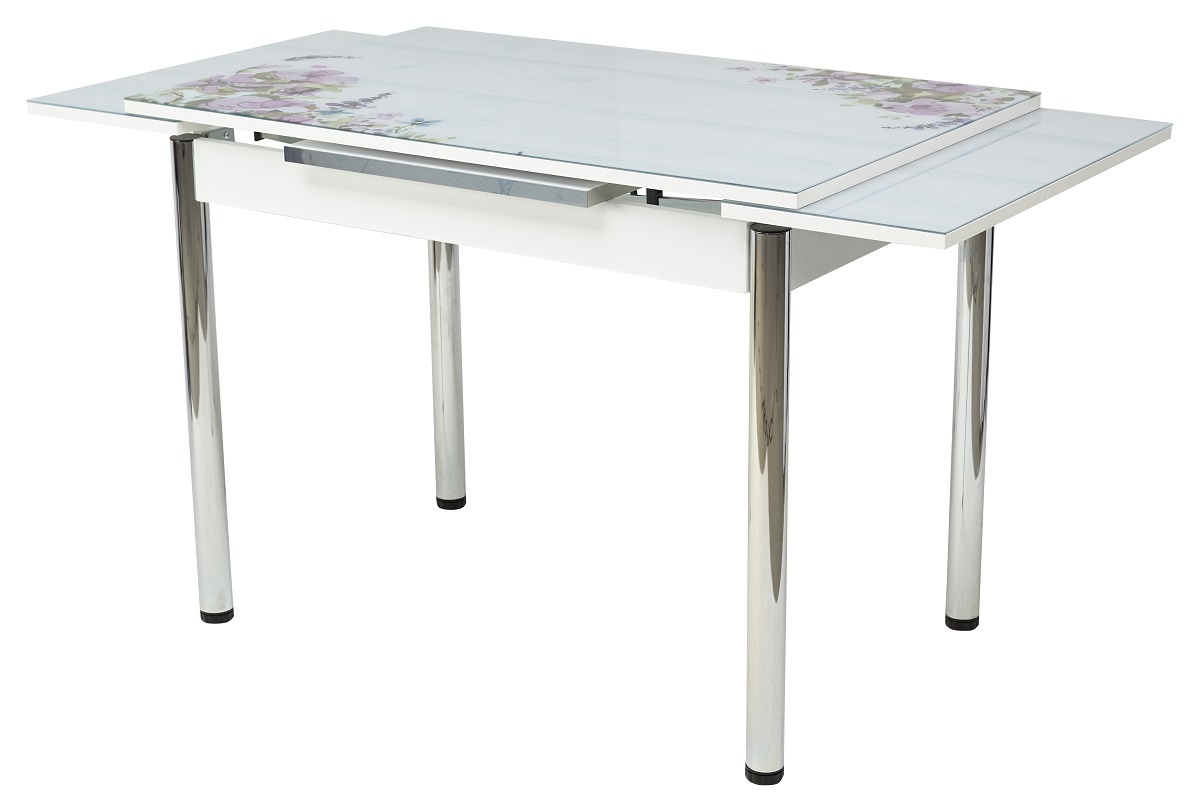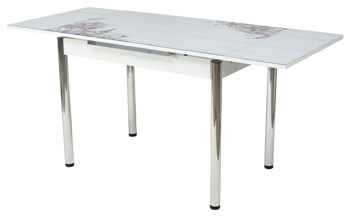 код 114628Раскладной белый стол из закаленного глянцевого стекла с рисунком.