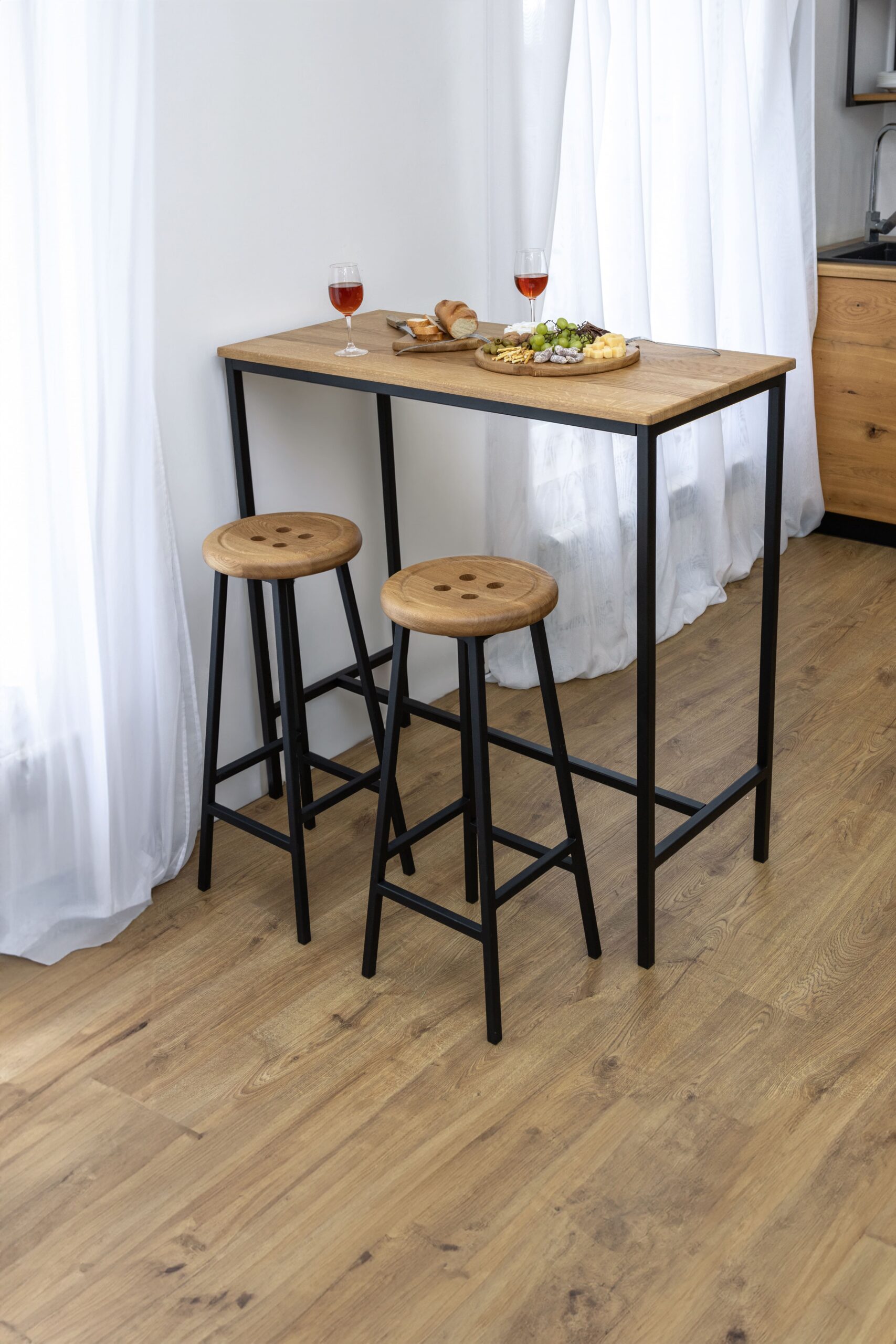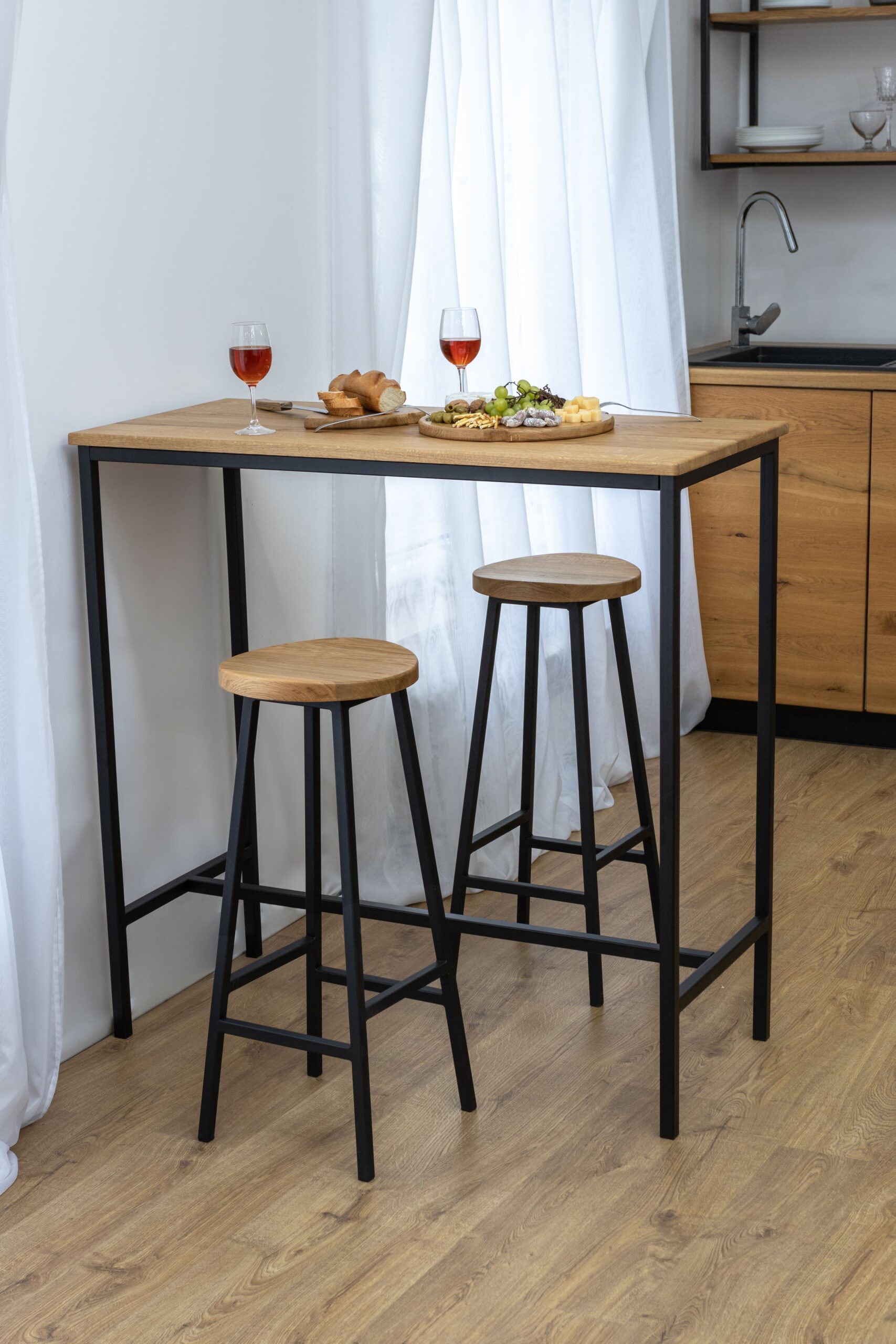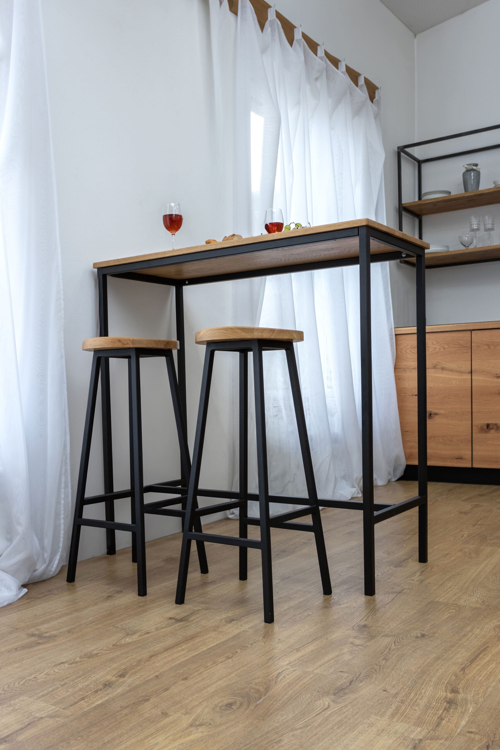 Барный стол отлично вписывается в такие стили как лофт, модерн, современный и скандинавский, подчёркивая индивидуальность и уникальность декора. Наш стол универсален и может использоваться как в домашних условиях на кухне, балконе, в гостиной, коридоре, лоджии, так и в общественных местах, таких как бар, кафе, ресторан, клуб и офис. Столешница из натурального массива дуба – покорит Вас текстурой, запахом дерева и эстетикой.