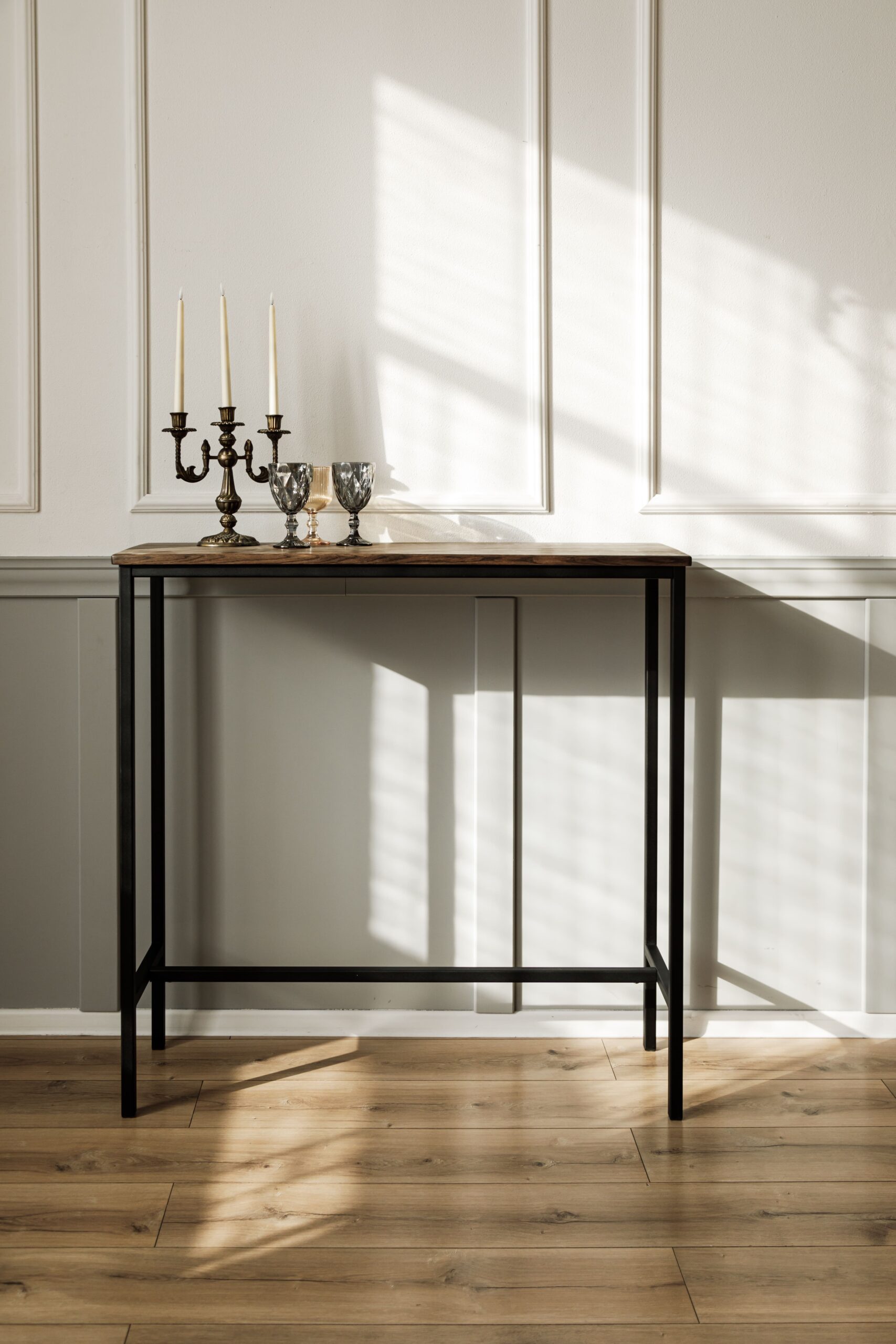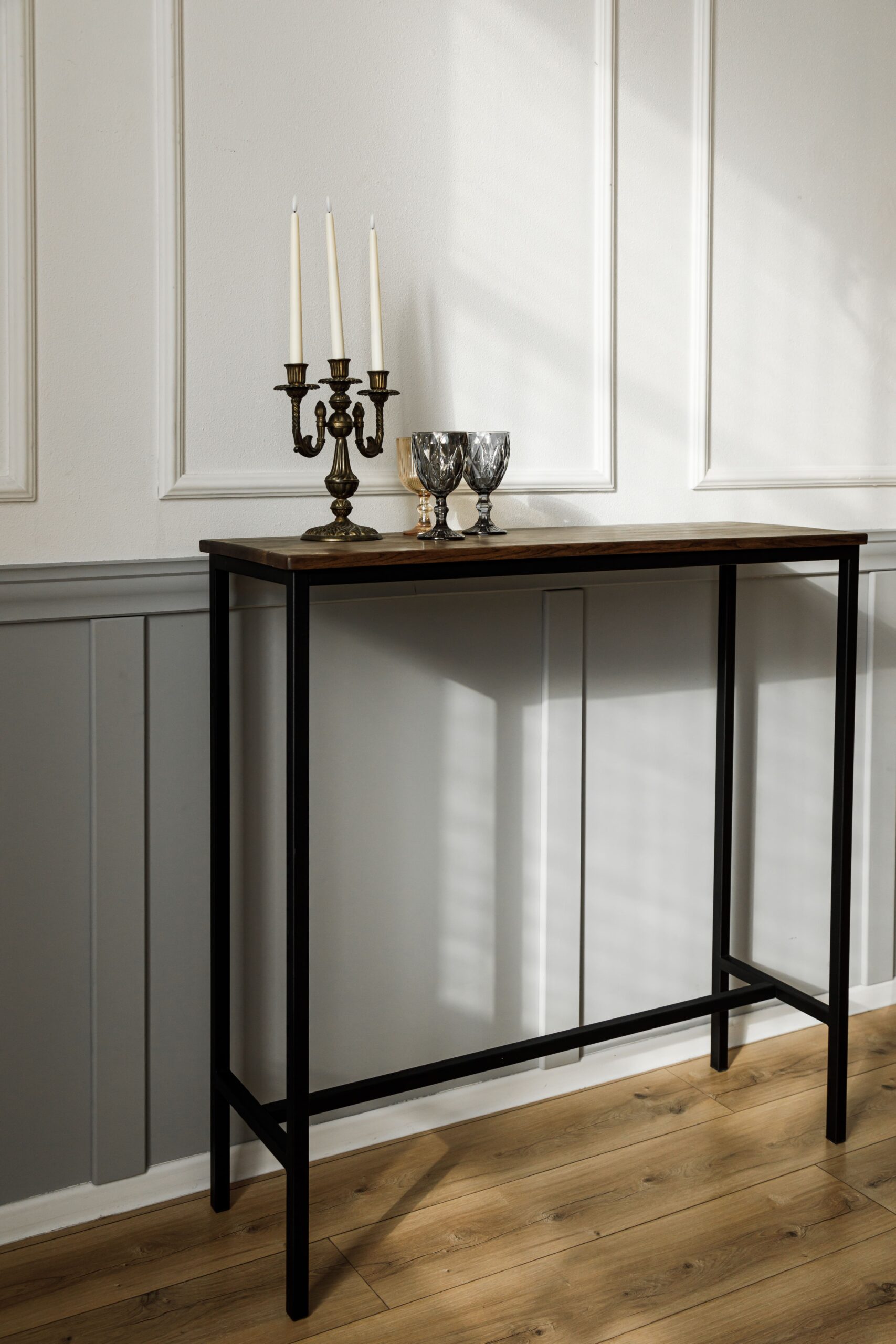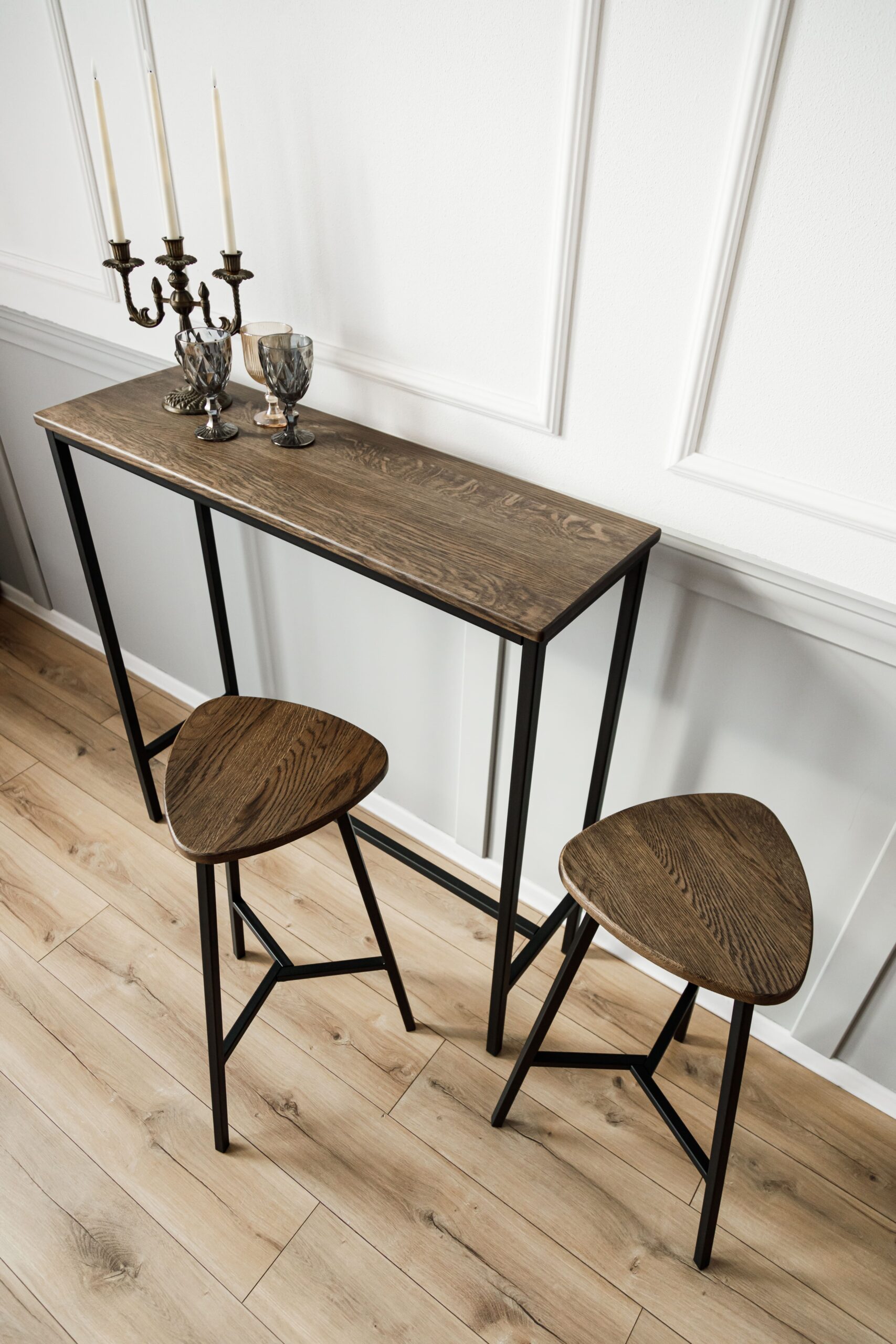 Прямоугольный барный стол, консоль. Выполнен из массива дуба и металла.