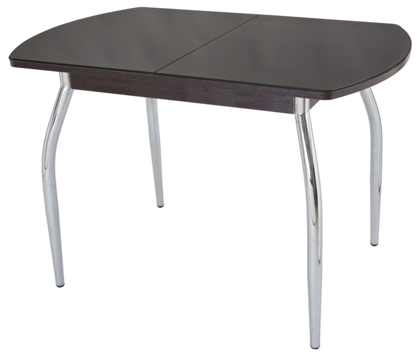 Стол «Чинзано ПО-1» установлен на фигурные металлические опоры, покрытые хромом. Столешница выполнена из ДСП и стекла, раскладывается при помощи механизма «бабочка». Простой и лаконичный внешний вид делает модель подходящей для любого интерьера.