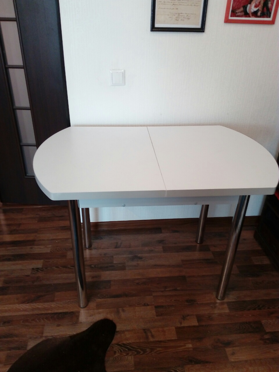Раздвижной стол «Европейский 7» отличается своей необычной формой крышки, установленной на цилиндрические хромированные ножки. Белая цветовая гамма поверхности дополнена серебристой полосой по периметру, что создает единый и интересный ансамбль в сочетании с хромированными ножками. На ножках предусмотрены пластиковые заглушки для предотвращения появления царапин на напольном покрытии.