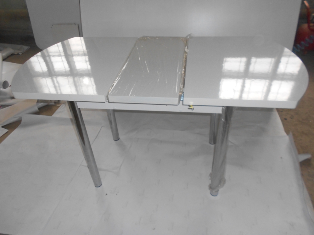 Кухонный стол в стиле Хай-тек на круглых хромированных ножка. Овальная столешница с оригинальной 3D-фактурой легко раскладывается, позволяя уместить на банкет большое количество гостей.