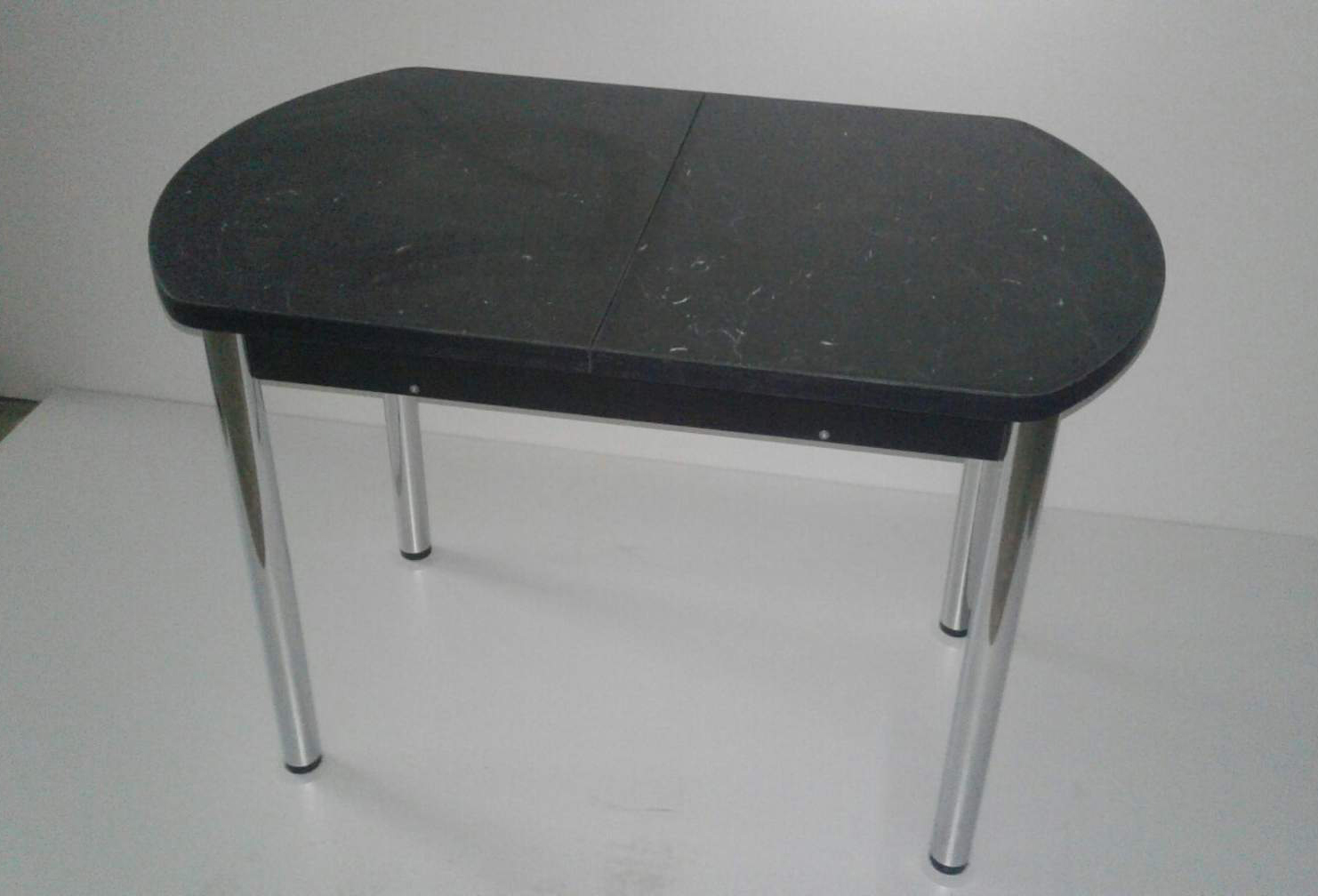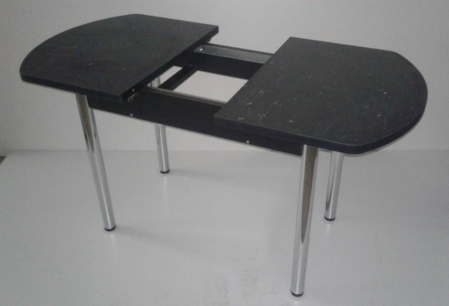 Стол «Раздвижной». Кухонный стол изготовлен из высокопрочного пластика, что делает его более долговечным и устойчивым к большим нагрузкам. Крышка декорирована под черный мрамор, что делает модель очень изящной и интересной, и установлена на хромированные ножки с пластиковыми заглушками. Ножки металлические хромированные регулируемые до 3-ех см, высота 710 мм; 50 мм в диаметре.