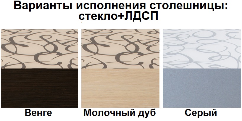 Ноги изготовлены из МДФ. Механизм раскладки «бабочка»: до 1470 мм (добор выполнен из ламинированного МДФ в цвет ламинированного ДСП). Цвет ДСП: молочный дуб, венге, серый. Цвет стекла: согласно образцам. Цвет ног МДФ: серый, кремовый, венге. Возможны любые цветовые сочетания столешницы и ног.