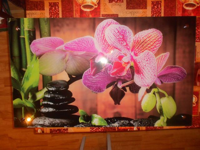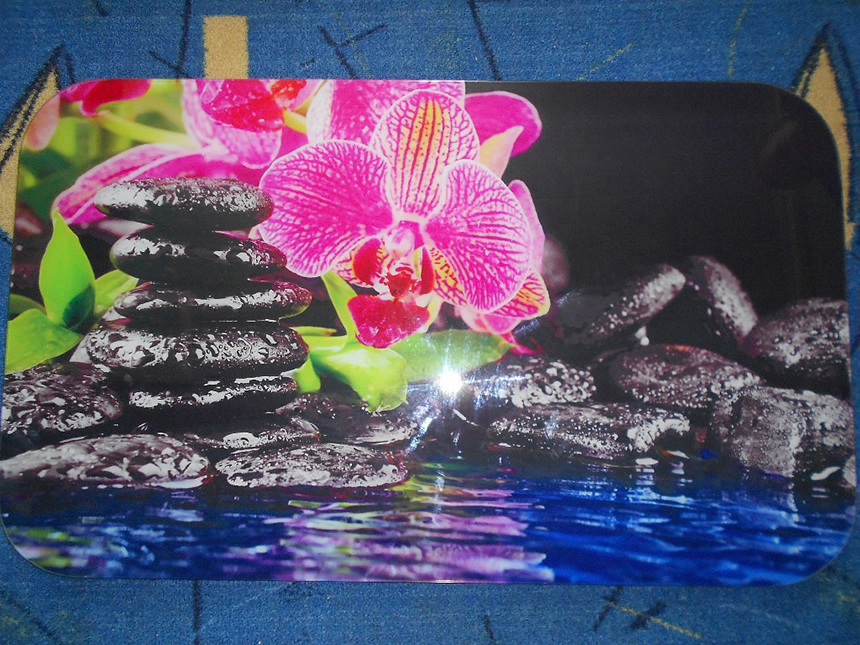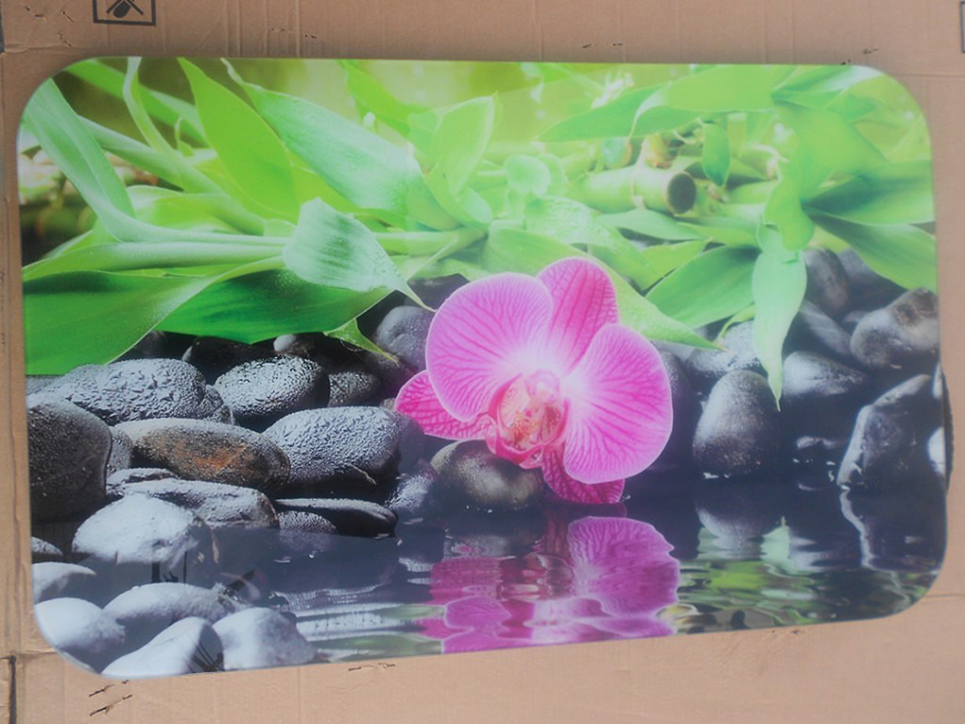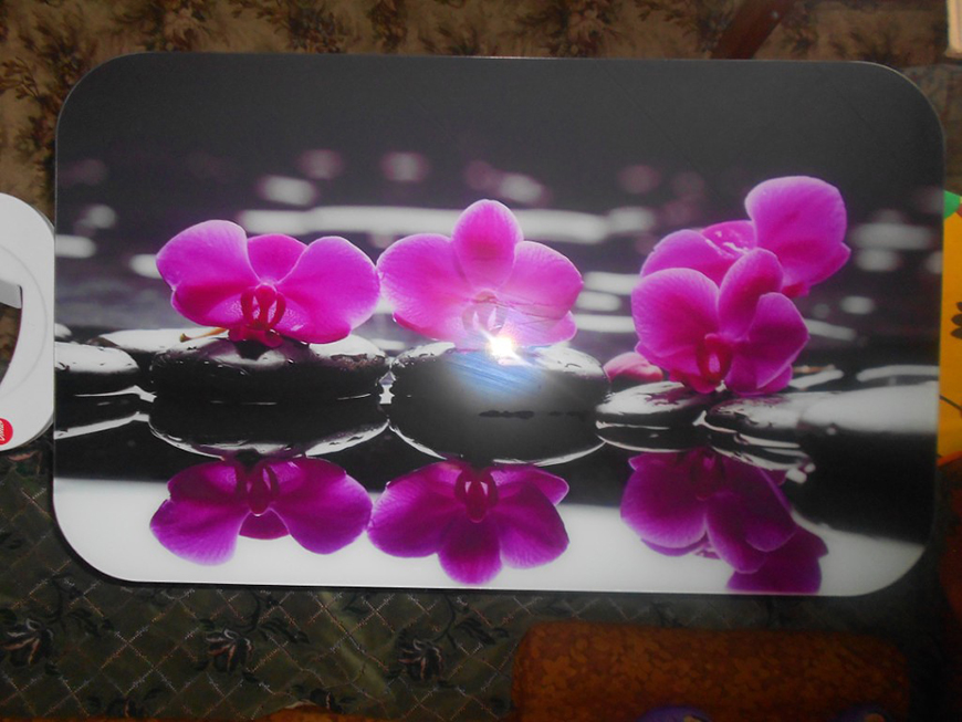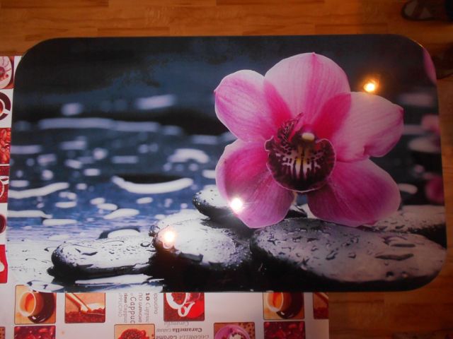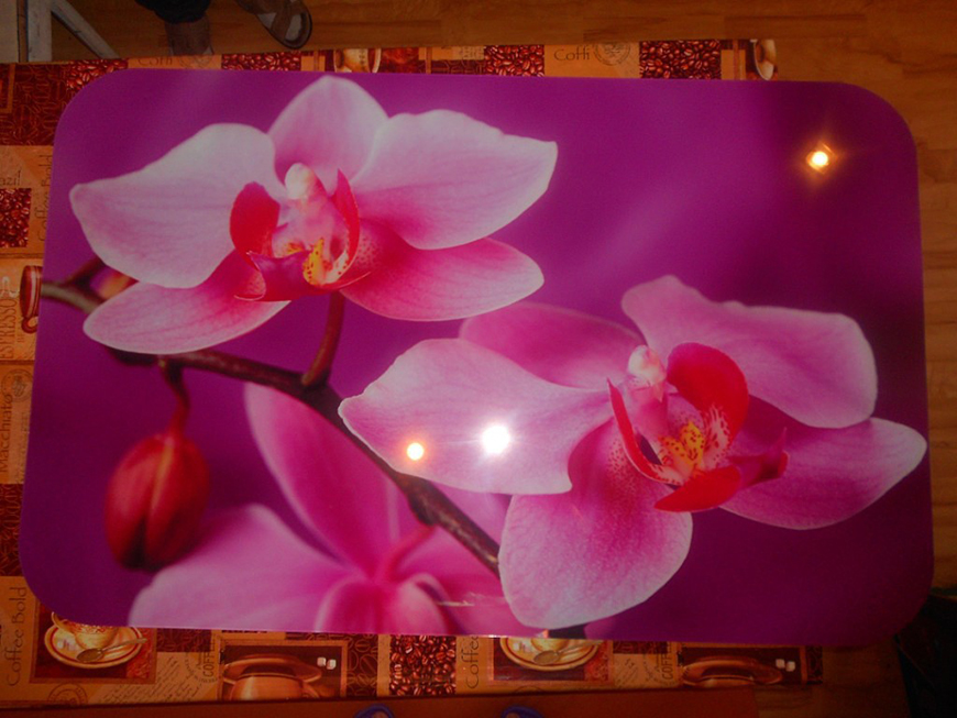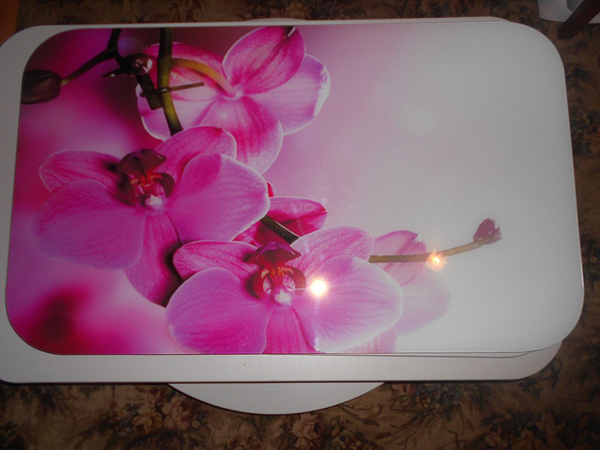 Ударопрочная столешница изготовлена из ЛДСП и термостойкого стекла. Края столешницы слегка закруглены, что делает мебель совершенно безопасной при эксплуатации. Комплектация хромированными опорами. Декор ярким рисунком.