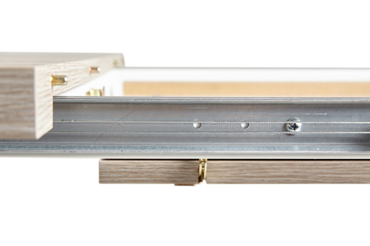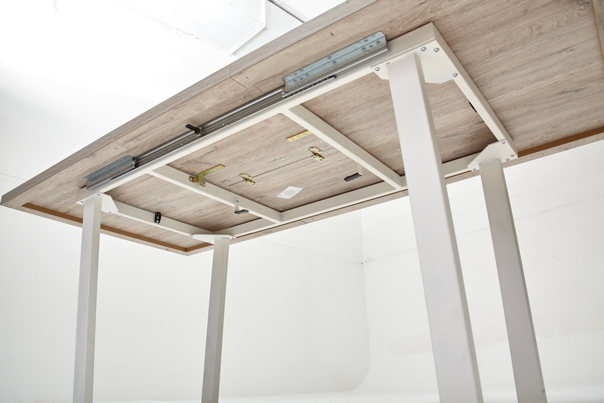Столешница - ламинированный ДСП. Толщина столешницы 35 мм по бортикам, 18 мм - по центру. Немецкий механизм раскладывания POTTKER. Металлическая рама под столешницей. Расстояние между ножками - 100 см.