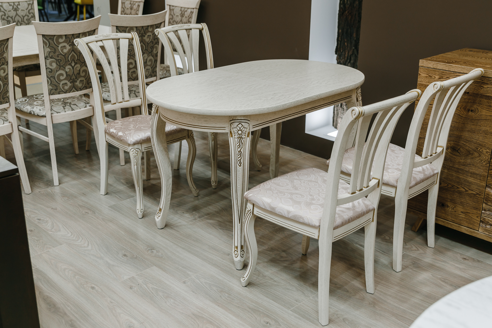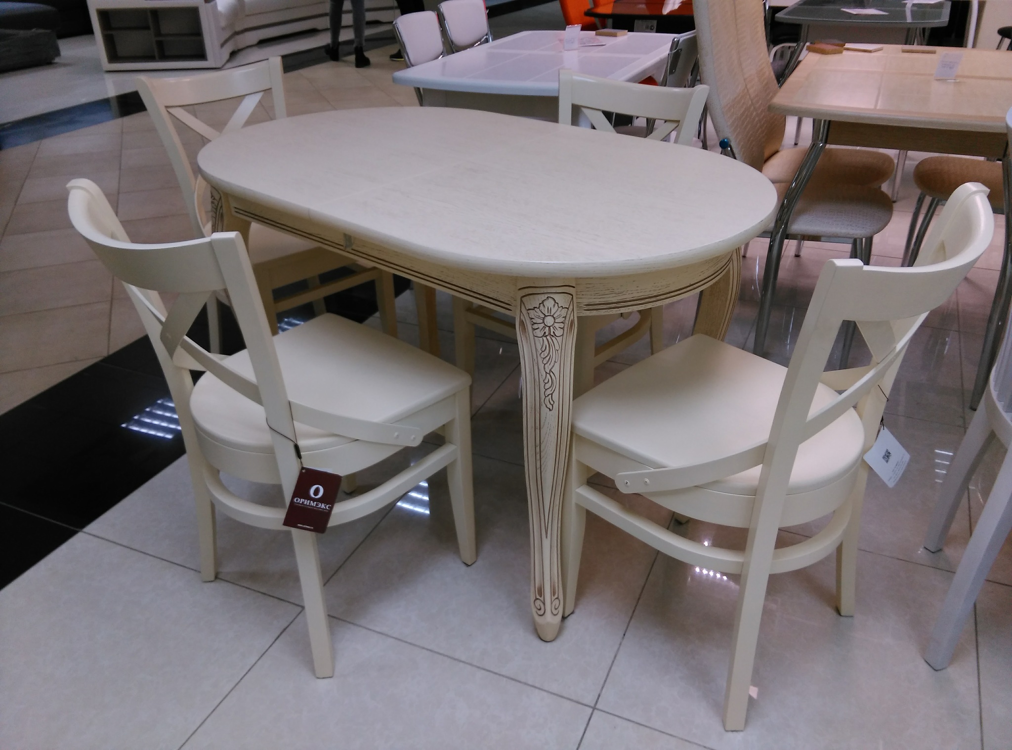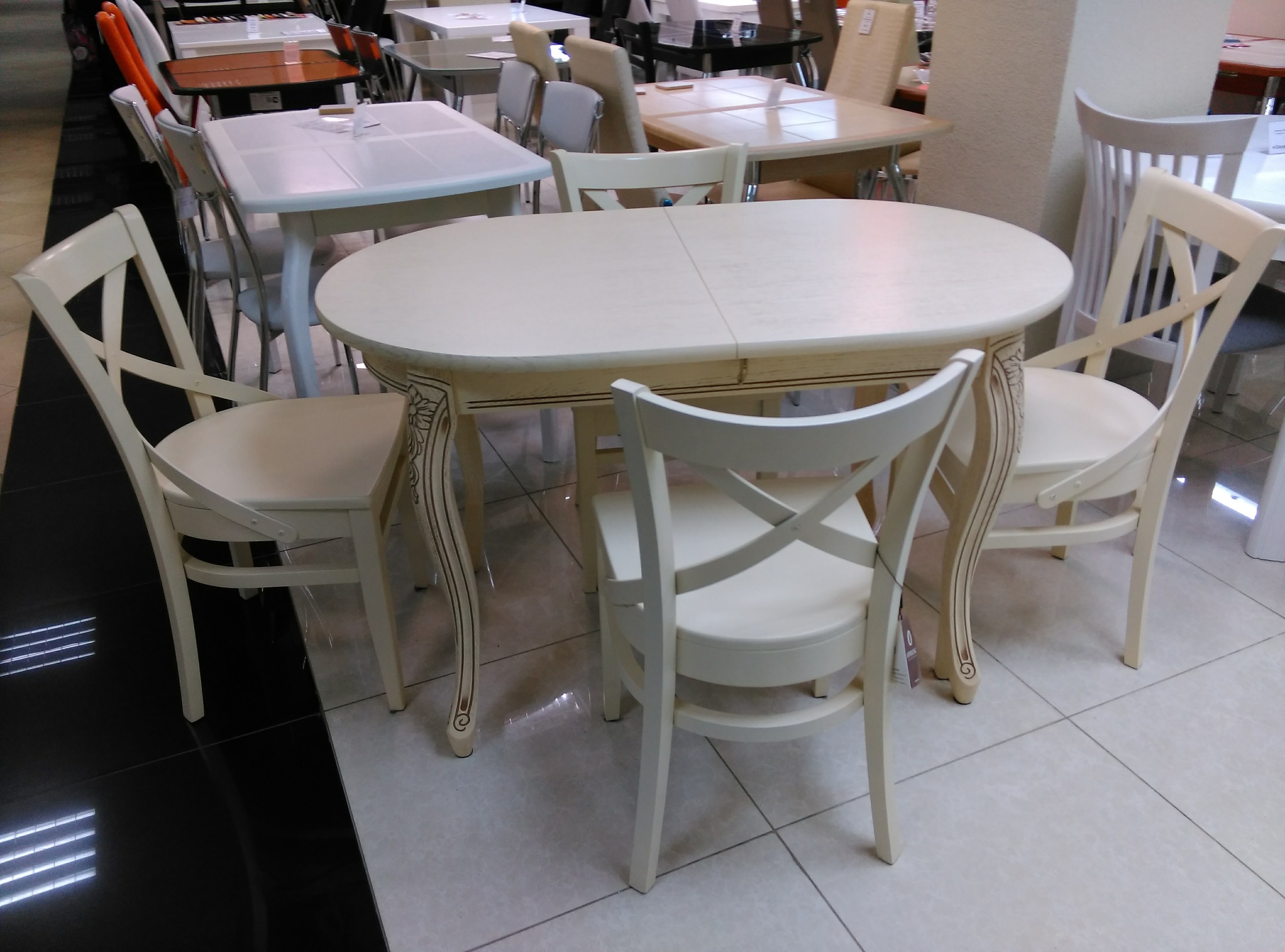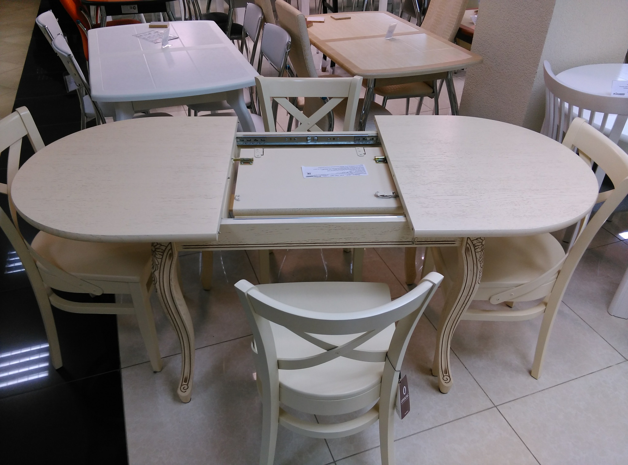 код 83096Столешница увеличивается за счет вкладыша-бабочки на 50 см. Ножки стола могут быть выполнены с резьбой или без.