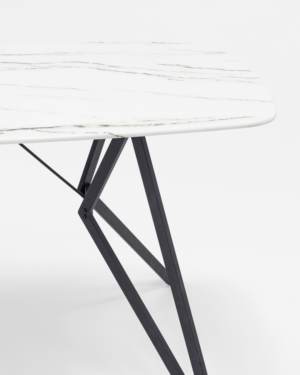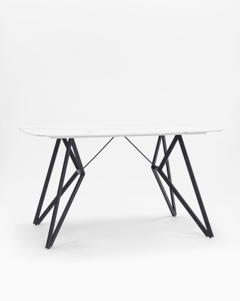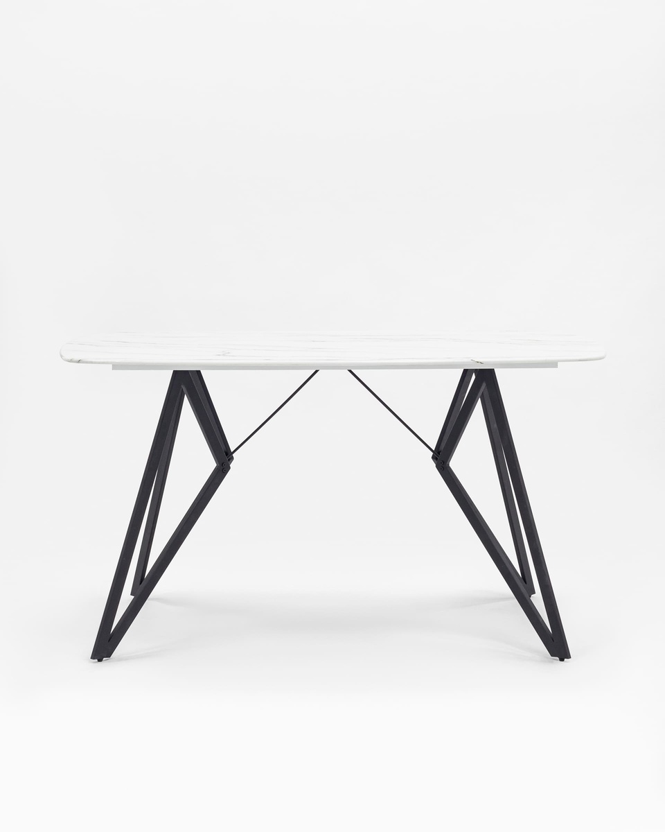 Белая столешница контрастирует с черным геометричным металлическим основанием. Ножки покрыты порошковой краской.