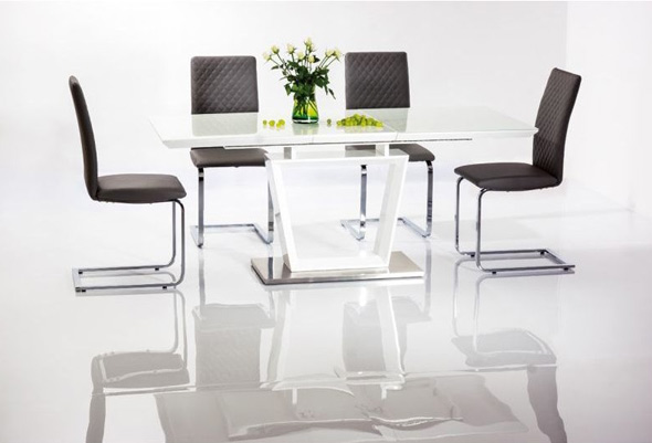 Обеденный стол «Lauren» – это прямоугольная модель с простым раскладным механизмом. Столешница выполнена из лакированного МДФ, имеет стеклянную поверхность. Цвет оформления – белый.