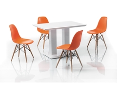 Обеденный стол отличается не только безупречным внешним видом, но и отменным качеством. За устойчивость модели отвечают четыре деревянные ножки, поддерживающие прямоугольную столешницу, изготовленную из МДФ. Стол будет отлично смотреться на кухне или в интерьере столовой.