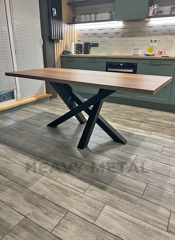 “Оверкилл” – эффектный обеденный стол в стиле лофт. Обращает на себя внимание необыкновенно выполненным подстольем, напоминающее противотанкового ежа. Брутальности привнесет и столешница из ЛДСП толщиной 36 мм. Помимо просторной кухни этот стол может и украсить офис в переговорном кабинете компании. “Оверкилл” – стол на 8 человек.