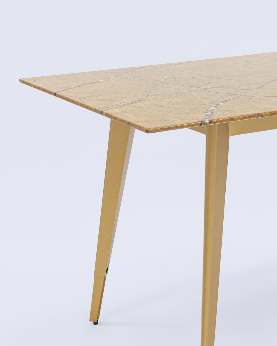 Обеденный стол с красивой стеклянной столешницей насыщенного цвета охры с рисунком под мрамор.