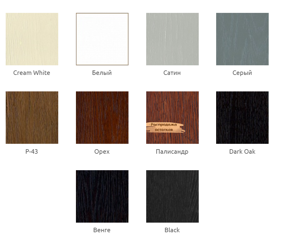 Выполняется в следующих цветах: Cream White, Белый, Сатин, Серый, Dark OAK, Венге, Орех, Палисандр, Р-43.