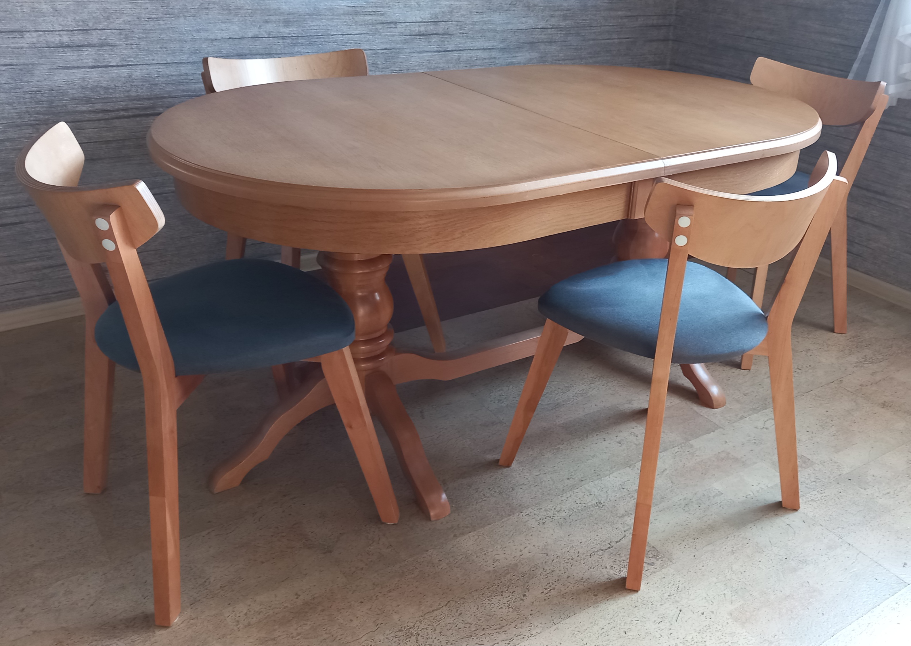 Универсальность, качество и надежность – так можно описать данную модель. Ножки изделия выполнены из массива ольхи, столешница из МДФ. Также, она облицована натуральным шпоном дуба.