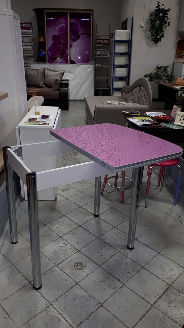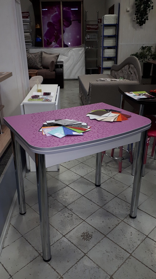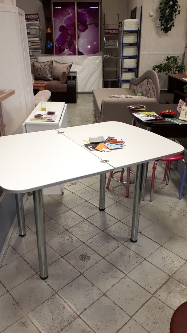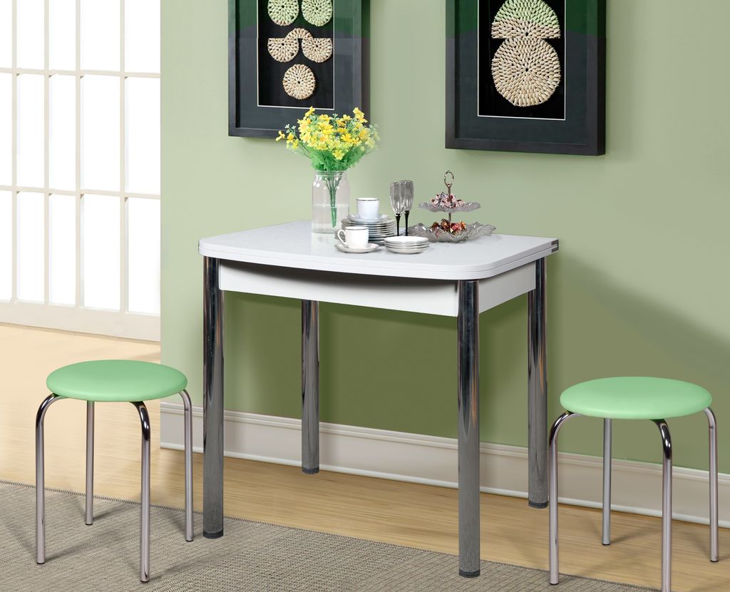 Современный поворотно-раскладной стол отлично подойдет для кухни любых габаритов. Столешница может быть декорирована разнообразными узорами, а цвет можно будет подобрать под интерьер кухни. Закругленные углы идеально подходят для того, чтобы исключить риск получить травму об острый угол стола. Ножки-колонны изготовлены из хромированного металла, добавляя прочности столу.