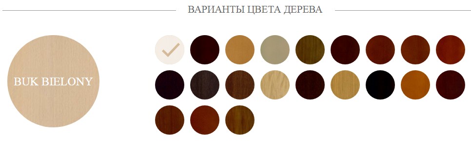 Возможные варианты расцветки: беленый бук, шоколадный бук, бук натуральный, бук сонома, орех карамелло, античная черешня, классическая черешня, черешня оранж, золотая черешня, дуб шоколадный, дуб серый, дуб гавана, дуб канадский модерн, дуб макао, дуб натуральный, дуб венге, ольха, орех, орех бразильский, орех бразильский - бук, орех карамелло "Катания Варадеро".