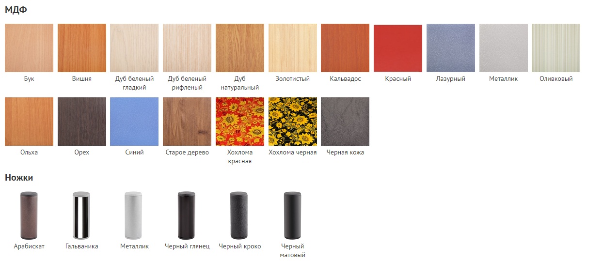 Цвета: бук, вишня, дуб беленый гладкий, дуб беленый рифленый, дуб натуральный, золотистый, кальвадос, красный, лазурный, металлик, оливковый, ольха, орех, синий, старое дерево, хохлома красная, хозлома черная, черная кожа.