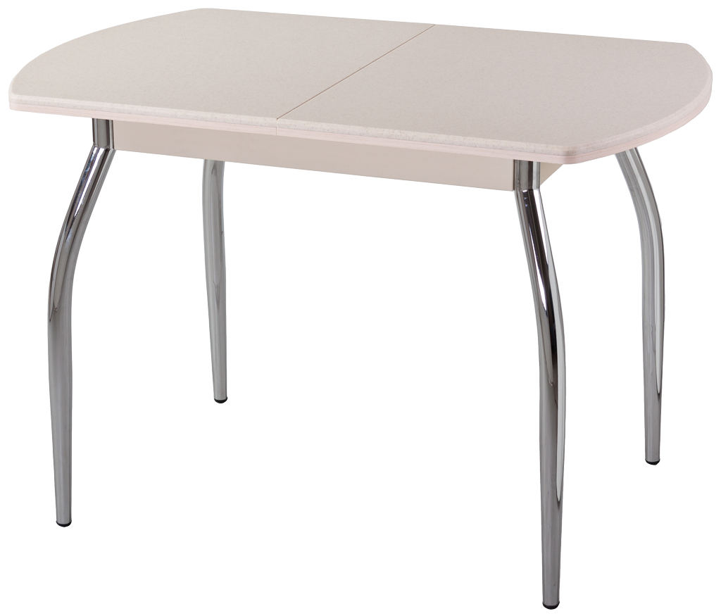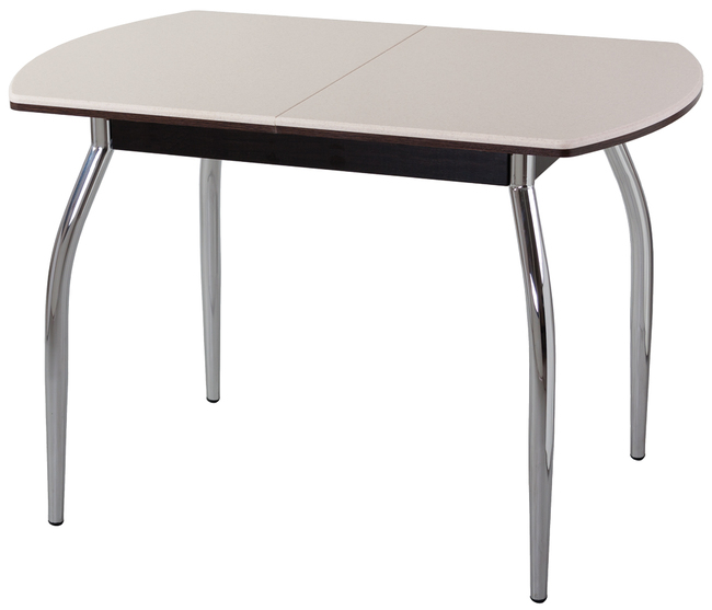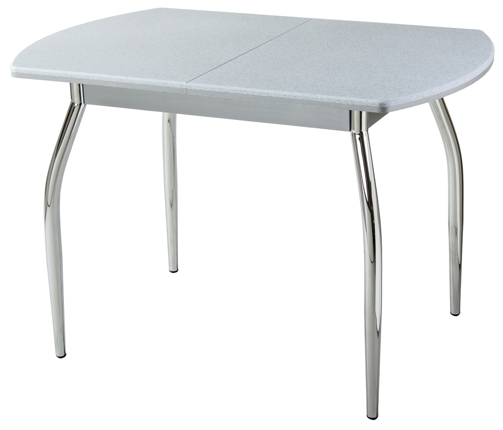 Стол «Реал ПО КМ» с двух сторон имеет небольшие закругления. Фигурные опоры из металла покрыты хромом. Столешница выполнена в сочетании ДСП, искусственного камня и МДФ. Модель оборудована раскладным механизмом «бабочка».