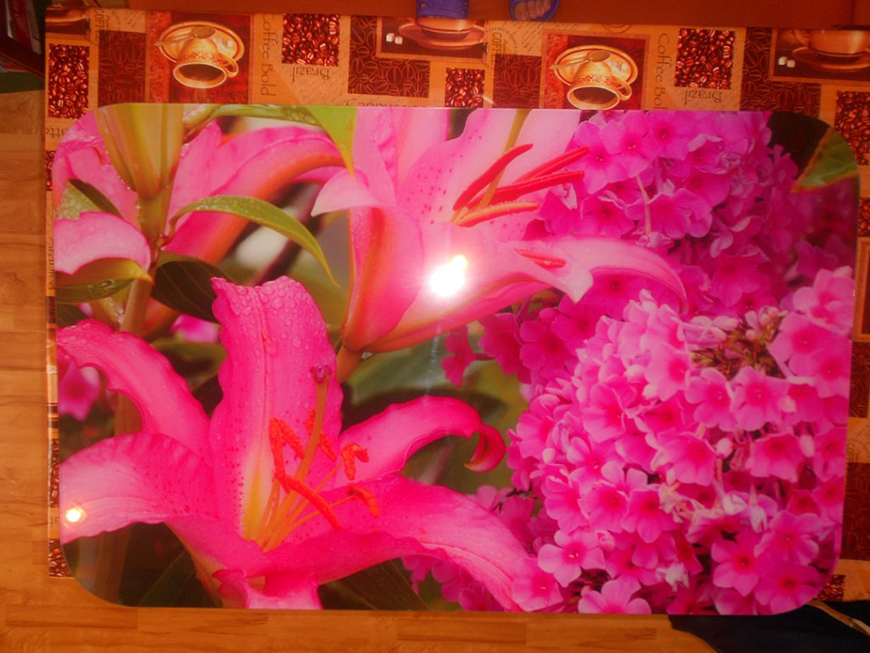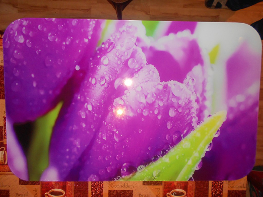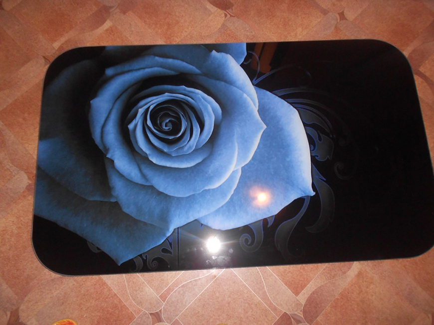 Ударопрочная столешница изготовлена из ЛДСП и термостойкого стекла. Края столешницы слегка закруглены, что делает мебель совершенно безопасной при эксплуатации. Комплектация хромированными опорами. Декор ярким рисунком.
