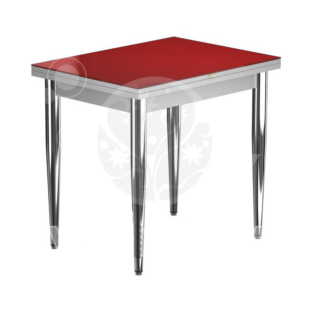 Современный раскладной кухонный стол. Столешница прямоугольной формы в красном цвете, изготовлена из высокопрочного стекла. Благодаря раскладному механизму можно изменять размер столешницы, увеличивая ее в размерах.