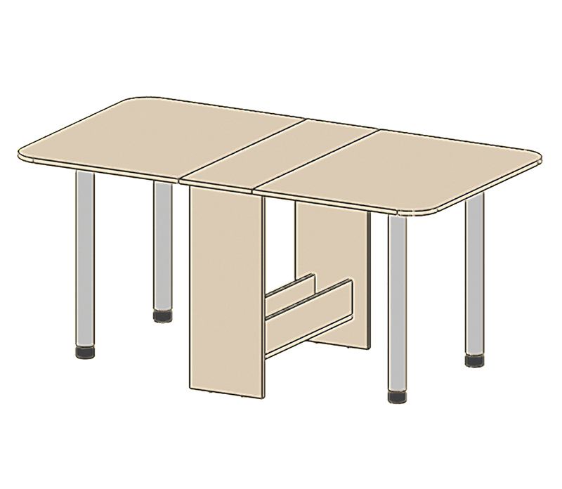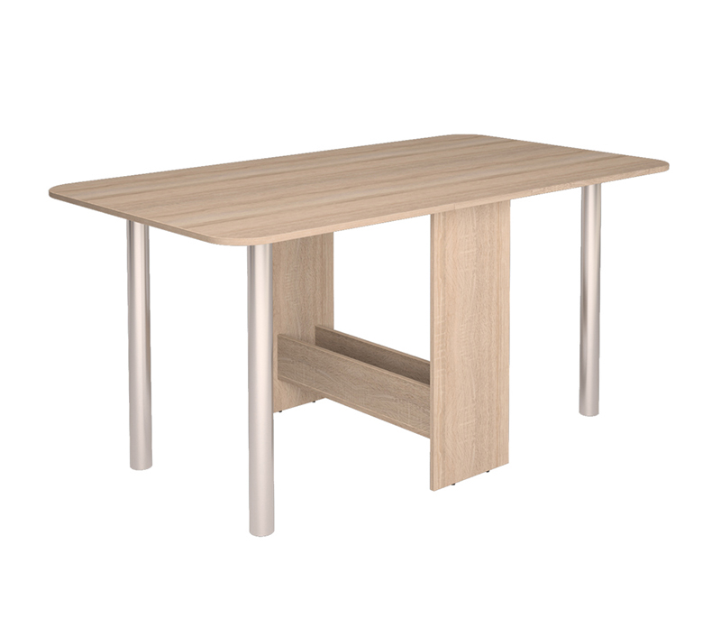 Этот удобный стол-книжка отличается практичностью и функциональностью. Он оснащён четырьмя металлическими опорами и двумя опорами из ламинированного ДСП. Столешница прямоугольной формы со скруглёнными углами имеет размер 90х160 см в разложенном виде.