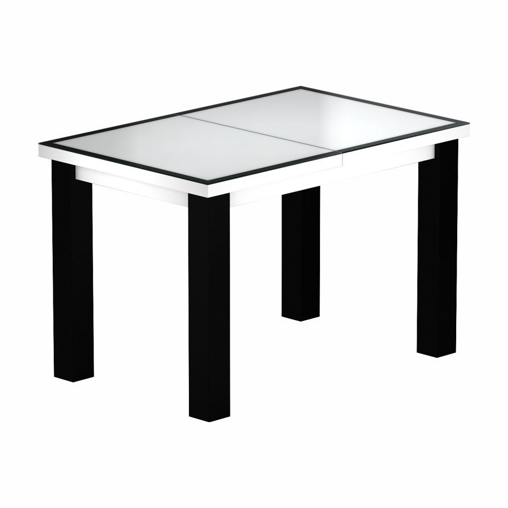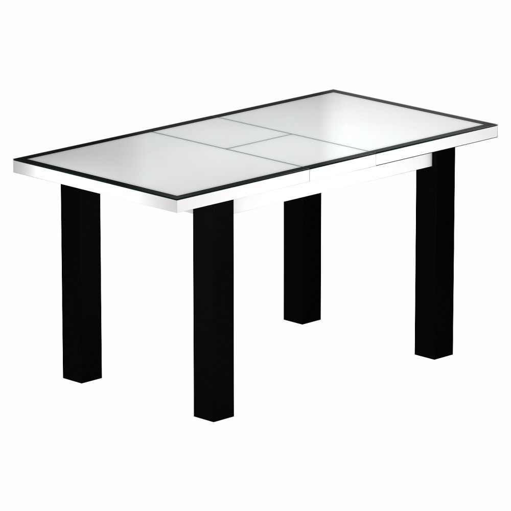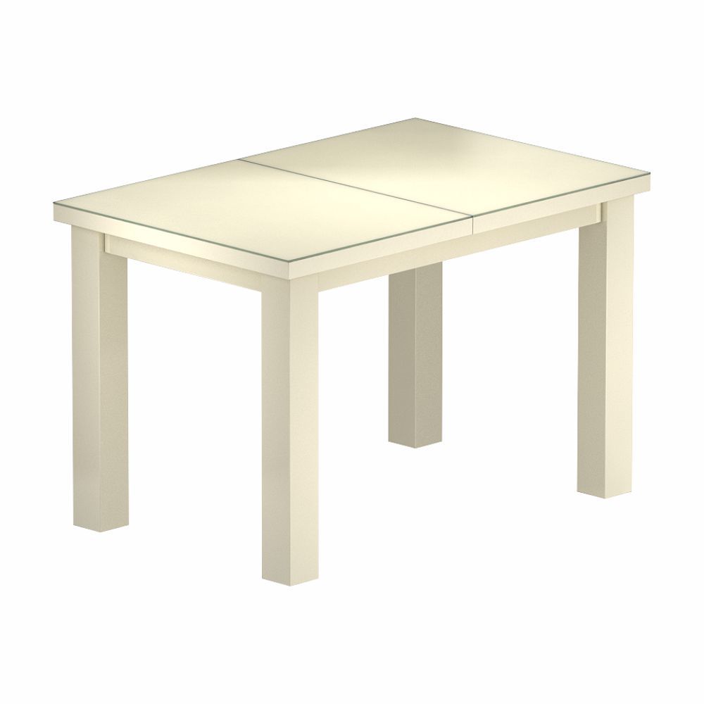 Кухонный прямоугольный стол со стеклянной столешницей и массивными опорами. Столешница изготовлена из высококачественного матового стекла, ноги - из современного ЛДСП, стол оборудован синхронно-раздвижным механизмом раскладки.