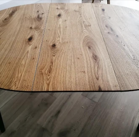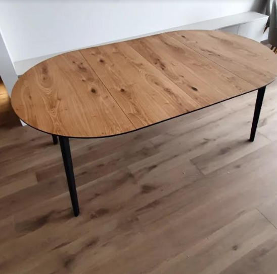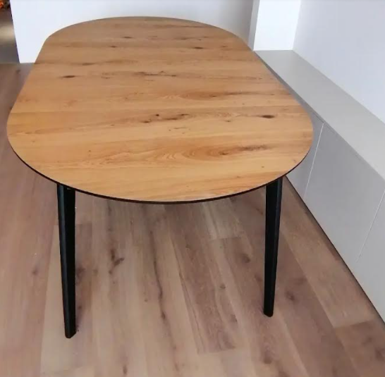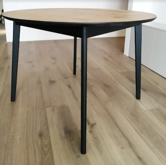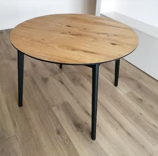 Столешница изготовлена из МДФ, шпонированный дуб винтаж, подстолье и ножки — массив дуба, окрашенный в чёрный цвет.
