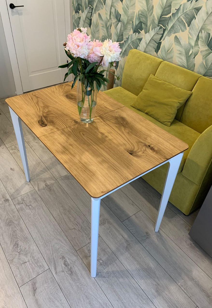 Ножки и подстолье — натуральный дуб, окрашенный в белый цвет.