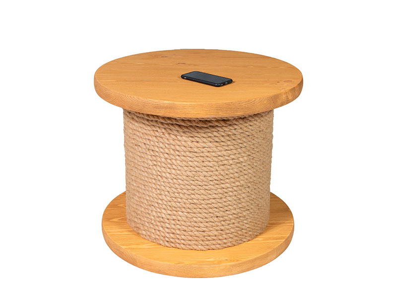 Круглый кофейный столик из натуральной древесины в необычном стиле напоминает канатную катушку. Столешница без царг на декорированной опоре. Отделка придаст аккуратности и добавит изысканности в интерьер гостиной, в саду, на балконе или на летней террасе.