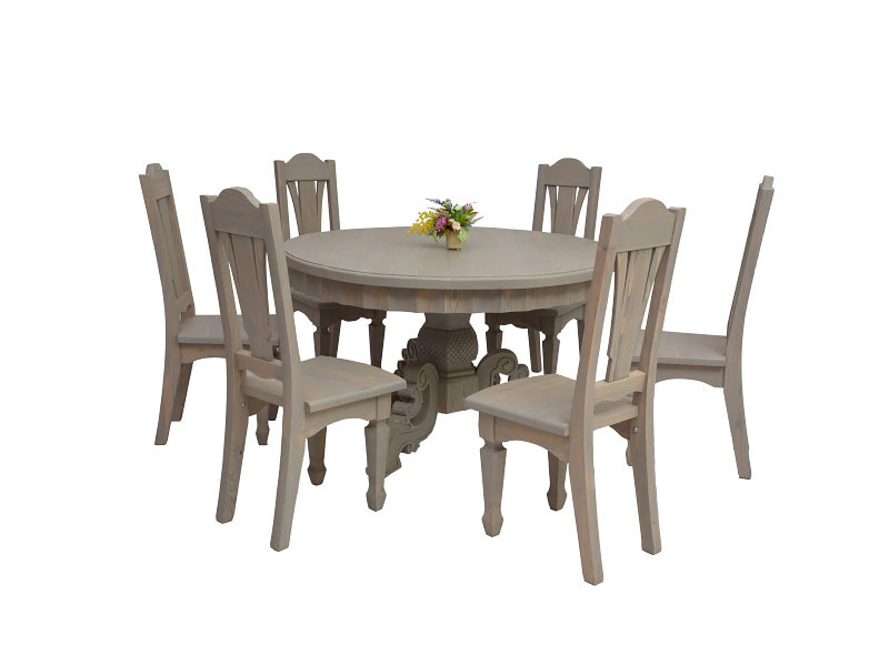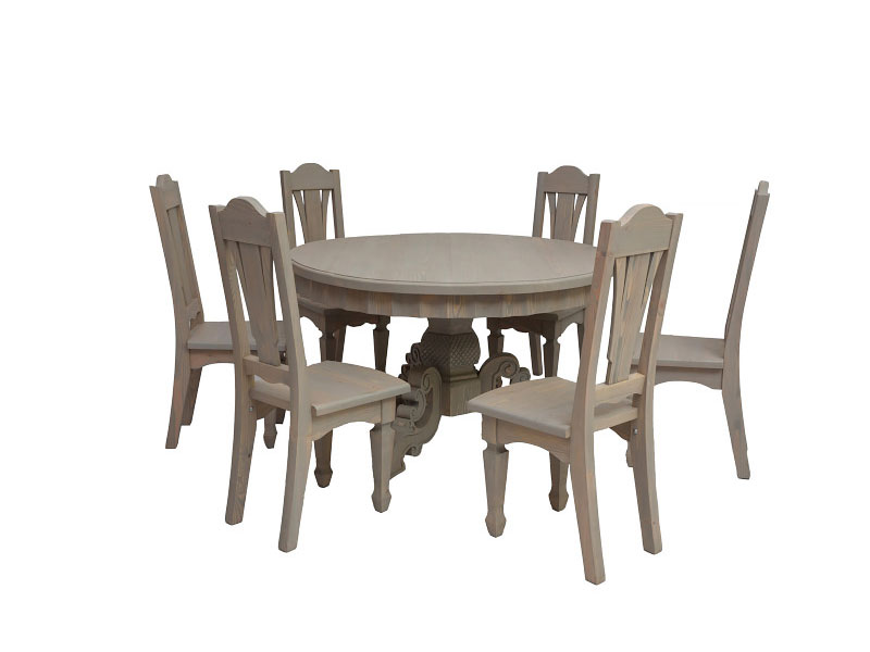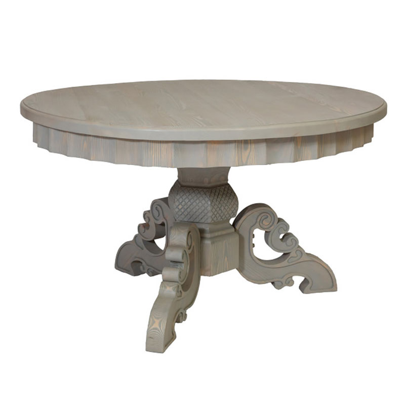 Круглый обеденный стол отличается своей вместительностью и удобством. Выполнен из качественных и практичных материалов, а потому сослужит вам долгую и надежную службу. Столешница размещена на единой массивной опоре, которая включает в себя фигурные резные лапы, придающие столу роскошный вид и изысканность. Интересное и стильное решение для тех, кто ценит комфорт и красоту.